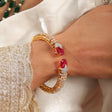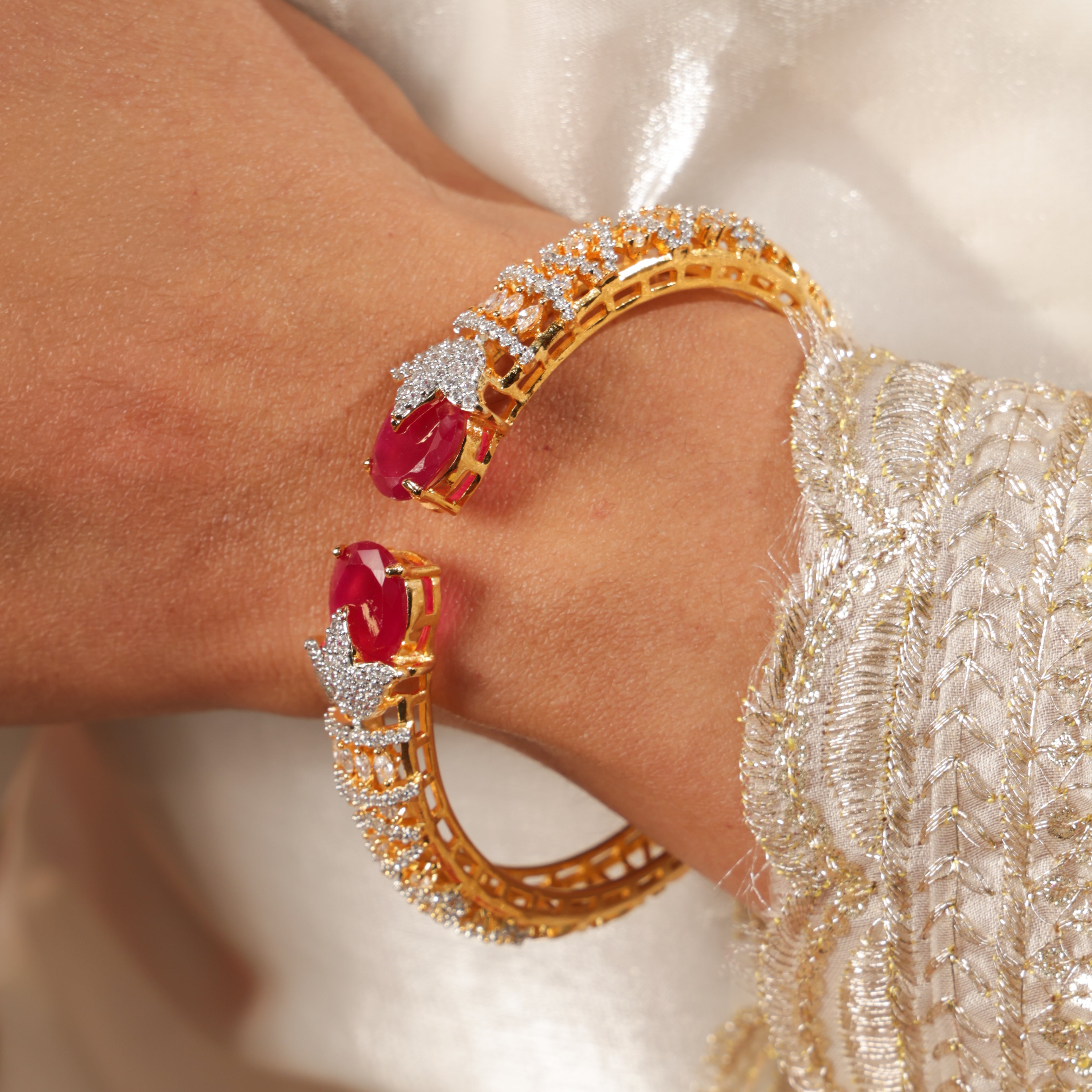 A luxurious gold-tone open cuff kada featuring two bold emerald-red center stones at each end, surrounded by intricate layers of sparkling CZ stones in a leaf-inspired pattern. The open design makes it easy to wear while giving a high-end, bridal look. Perfect for weddings, receptions, and grand festive occasions, this kada adds instant richness and elegance to any outfit.