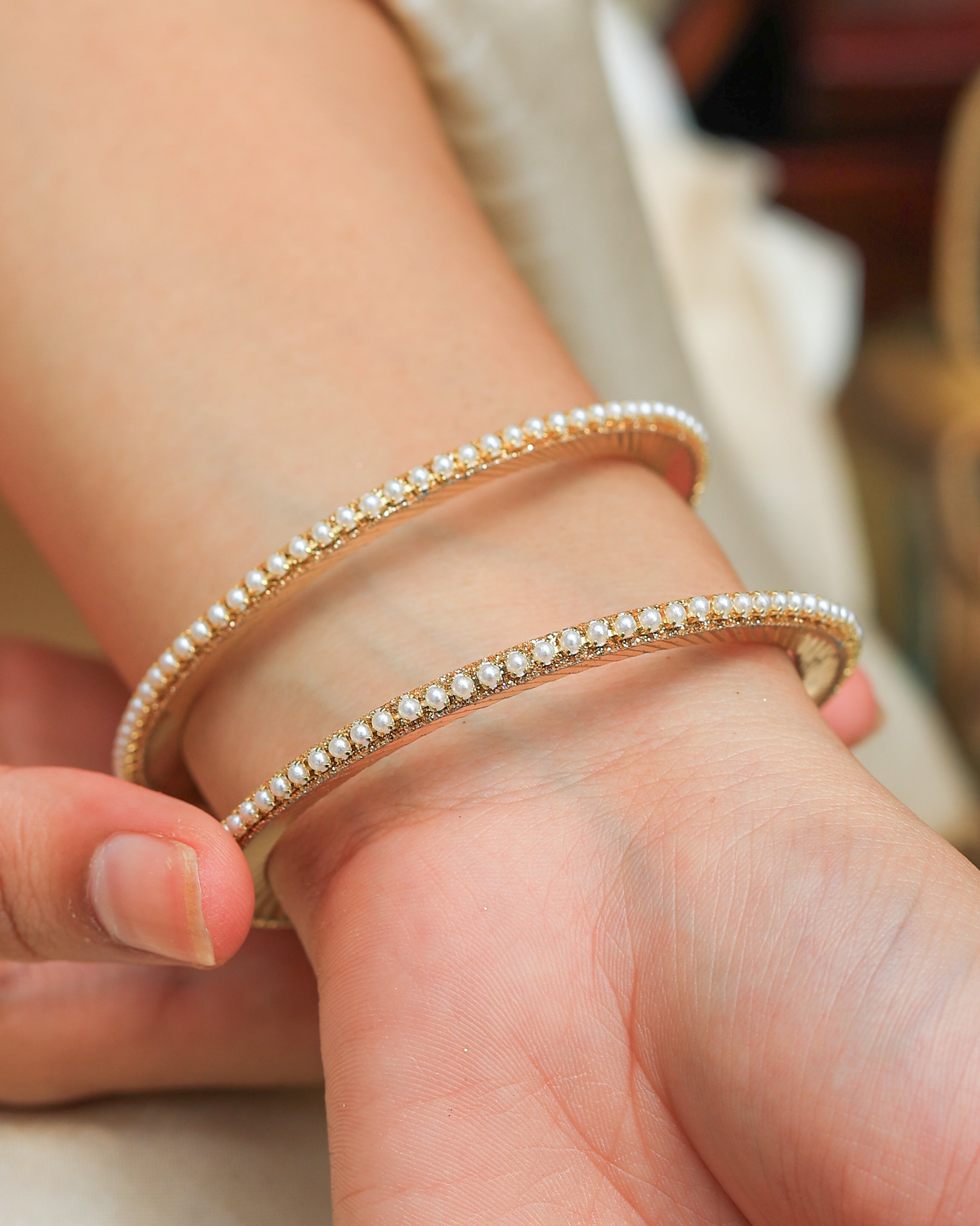 Delicate, graceful, and endlessly versatile — this set of two off-white pearl bangles brings a subtle elegance to your jewelry collection. Featuring a fine arrangement of small pearls on a sleek bangle base, these pieces blend traditional charm with contemporary style. Perfect for both festive occasions and everyday wear, they effortlessly complement everything from ethnic ensembles to modern minimal looks. Wear them solo for a refined accent or stack them with other bangles for a layered, chic appeal.