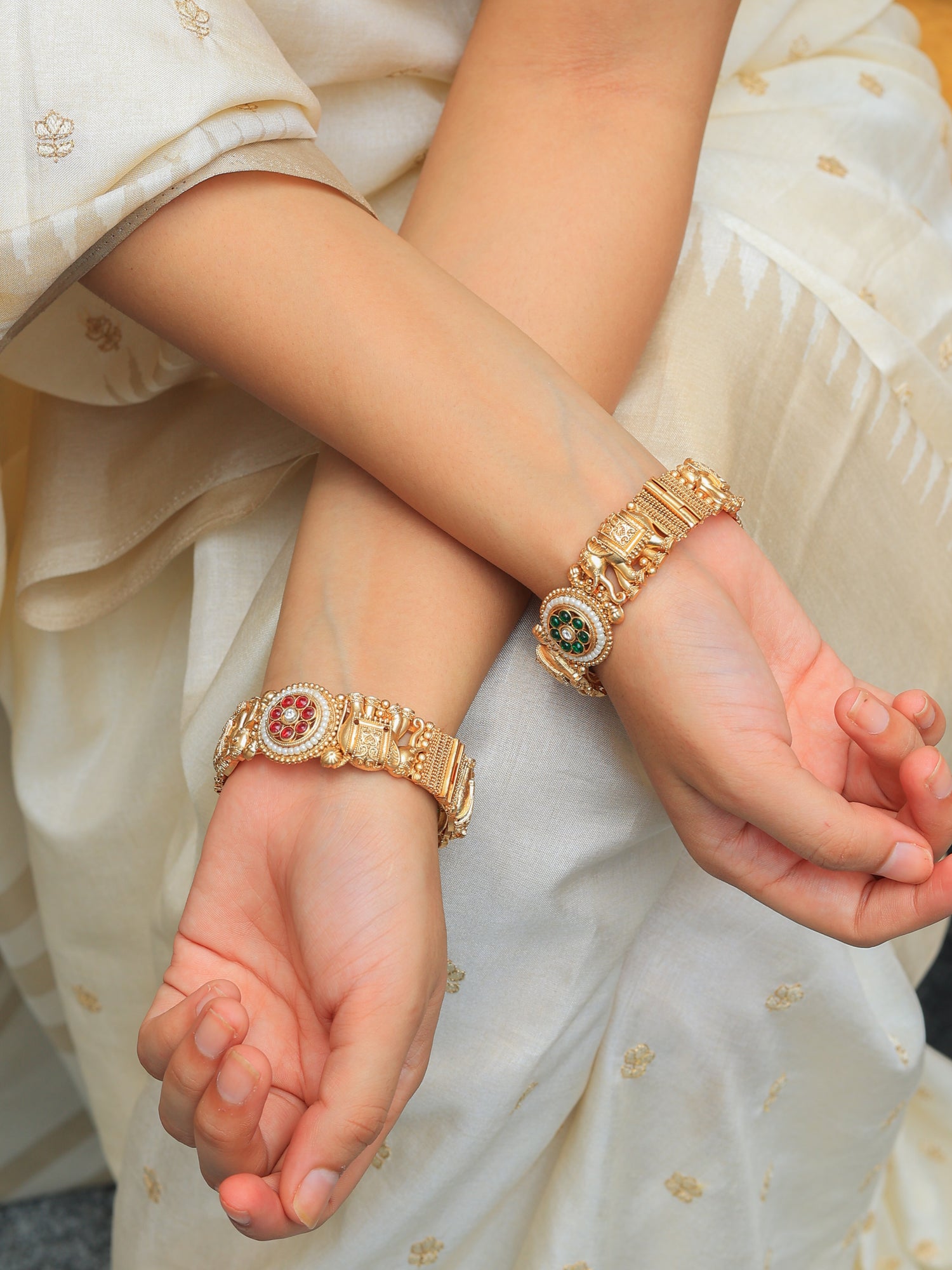 Embrace regal elegance with this striking Royal Kada, featuring a beautifully detailed elephant motif crafted in rich gold tones. Symbolizing strength, wisdom, and good fortune, the intricately designed elephant adds a powerful cultural touch to this bold and sophisticated accessory. Perfect for festive occasions, weddings, or making a statement with traditional attire, this kada blends timeless craftsmanship with royal grandeur. A true heirloom piece that celebrates heritage and style.