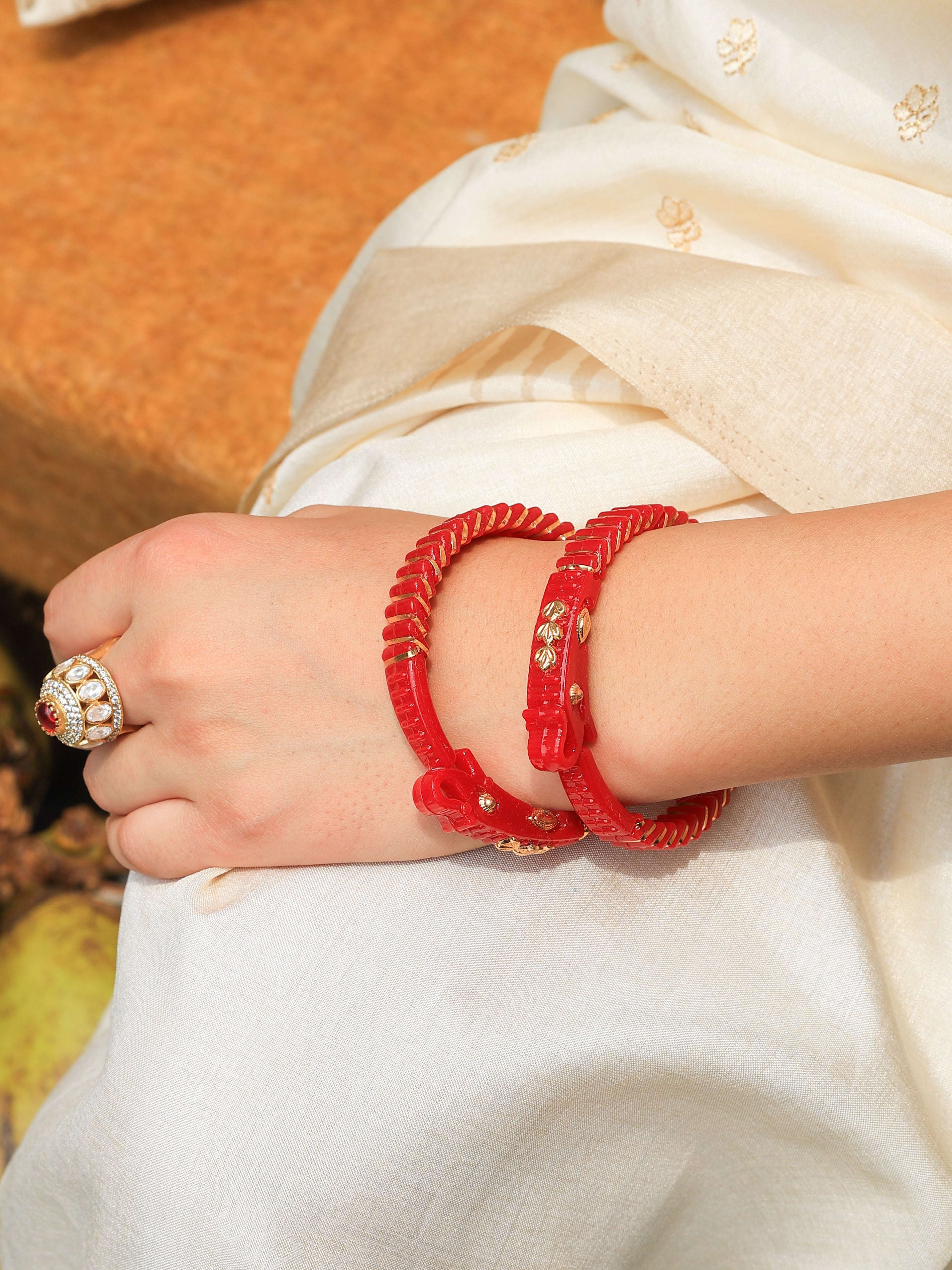 Deeply rooted in Bengali tradition, this Red Sakha Pola Bangle features a striking Hathi Mukh (elephant face) detail—symbolizing strength, wisdom, and good fortune. The bold red hues of the traditional Sankha (conch shell) and Pola (coral) bangles are beautifully complemented by the intricately crafted elephant motif, adding a regal and auspicious touch. Worn as a symbol of marital bliss and cultural heritage, this bangle is perfect for traditional ceremonies, weddings, and festive occasions. A timeless piece that honors tradition with elegance and grace.