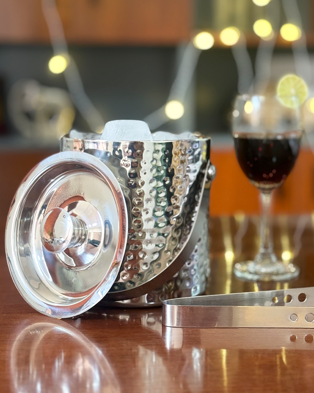 Keep the spirits high, can't go to the party,, bring the party home. Essential for any bar, classy and useful Ice Bucket with tongs in Nickel  finish. This dual tone piece is handcrafted with hammered design.
