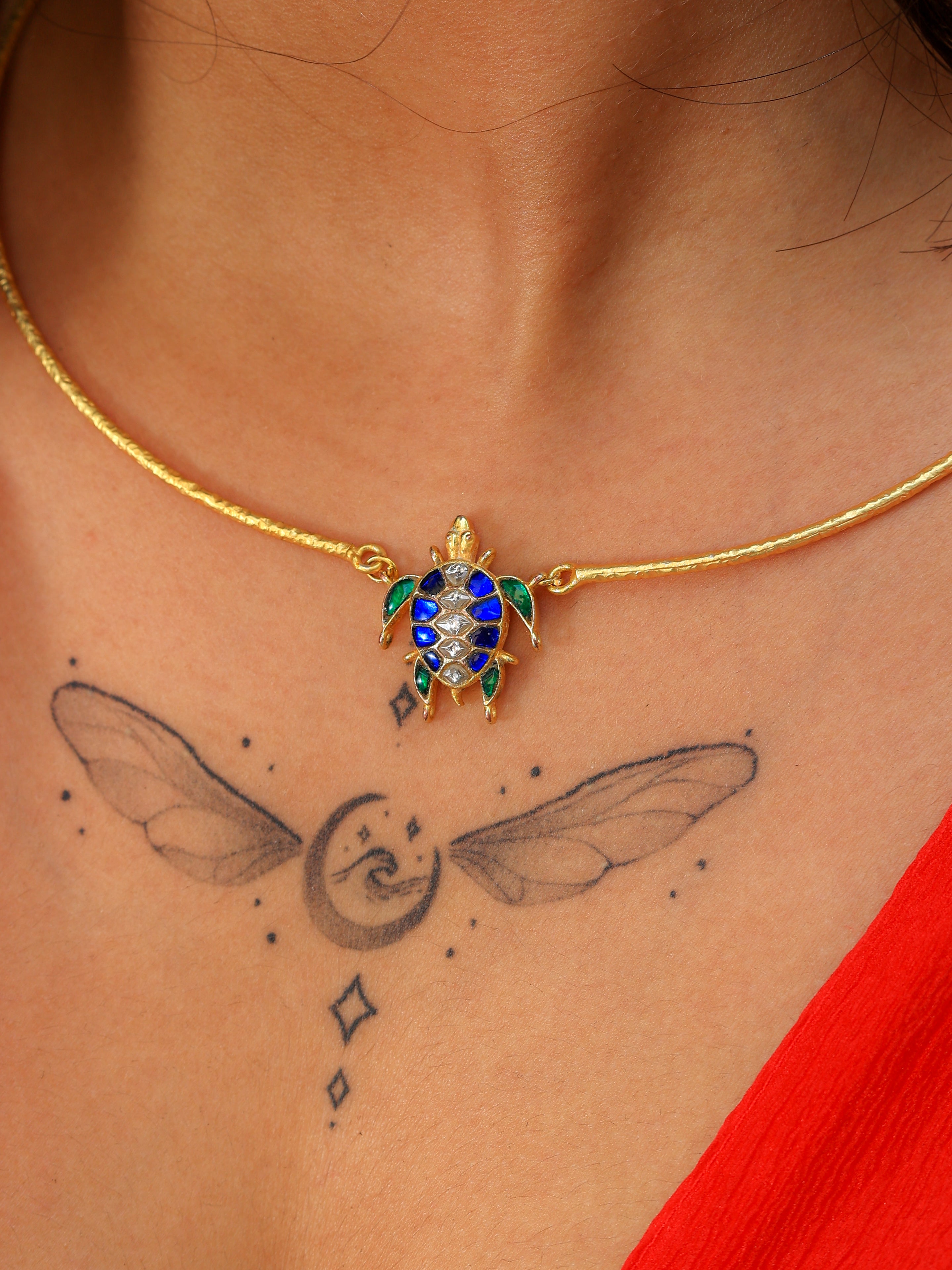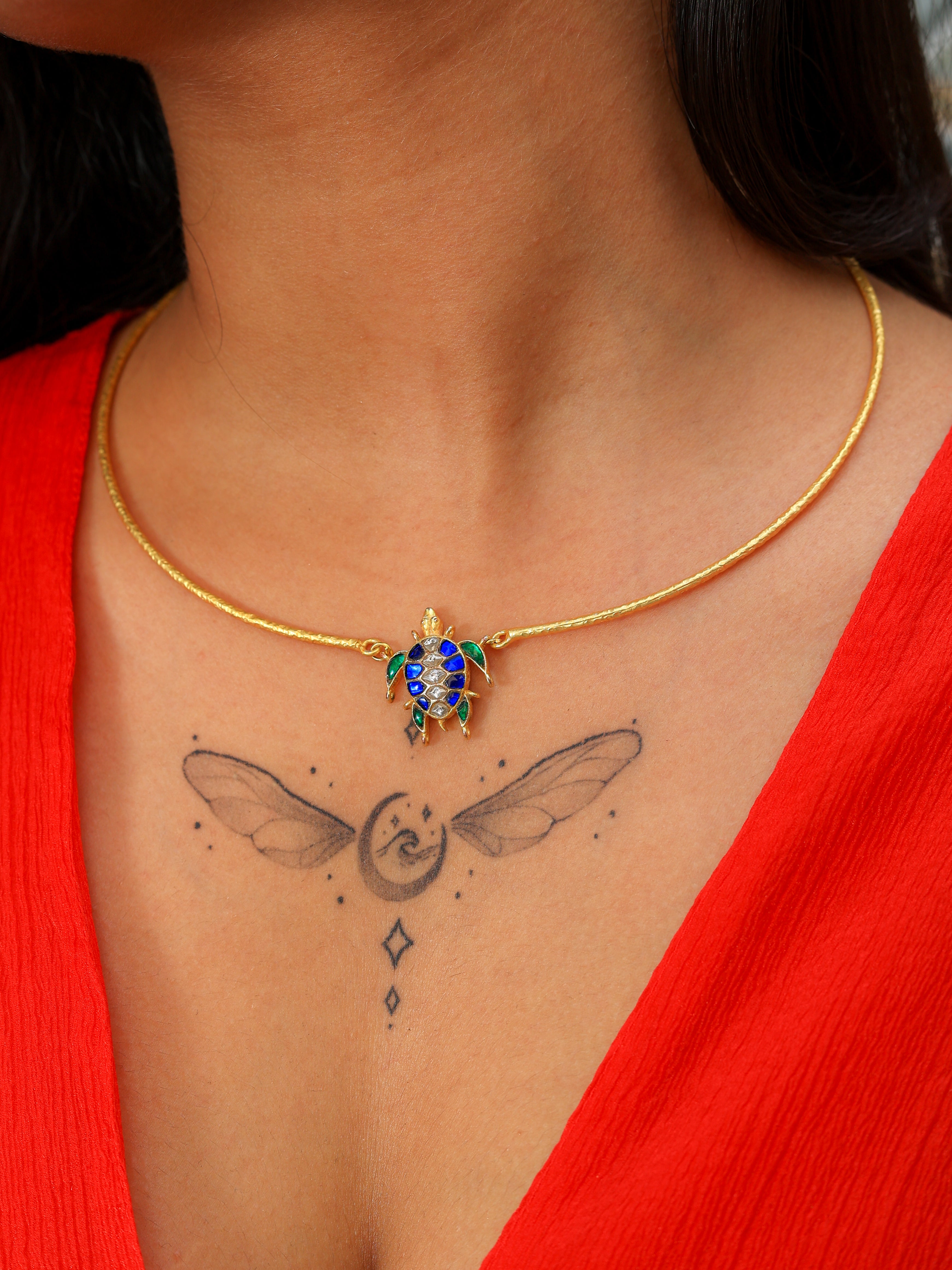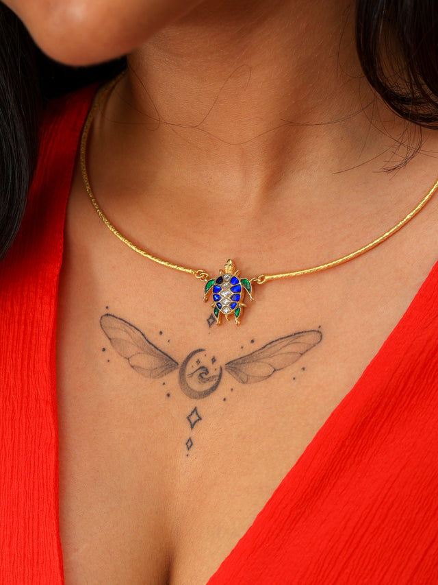 Celebrate heritage and symbolism with this beautiful Hasli necklace, featuring a charming tortoise pendant. The classic Hasli design, known for its bold, curved shape, pairs perfectly with the intricately crafted tortoise motif—an emblem of longevity, wisdom, and protection.