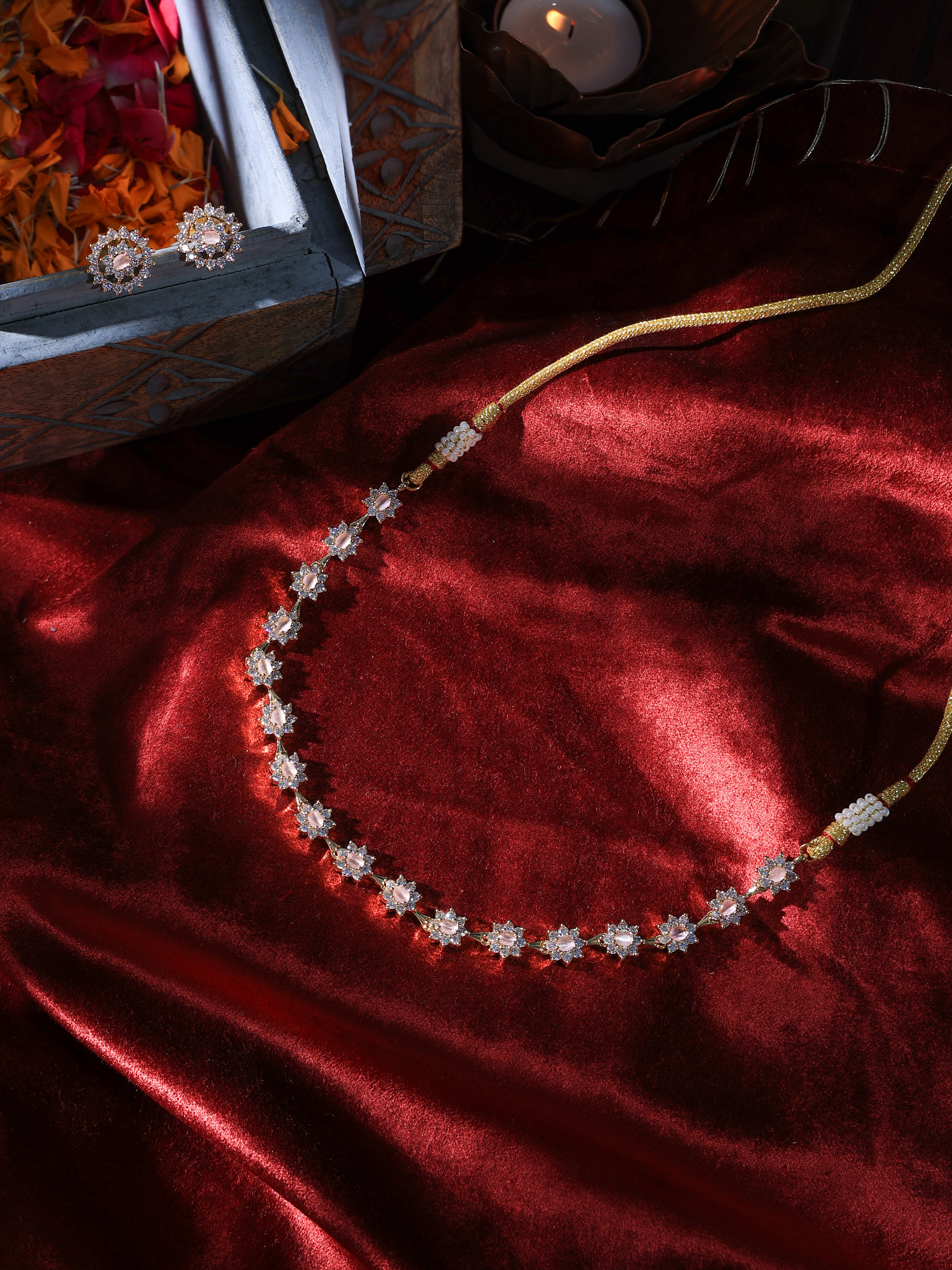 Graceful and timeless, this necklace set features an exquisite floral design that adds a touch of delicate charm to any ensemble. Intricately crafted with shimmering stones and fine detailing, the necklace beautifully drapes around the neck, while the matching earrings complete the look with understated elegance. Perfect for weddings, festive occasions, or adding a hint of sophistication to your evening attire, this flower-inspired set is a must-have in your jewelry collection.