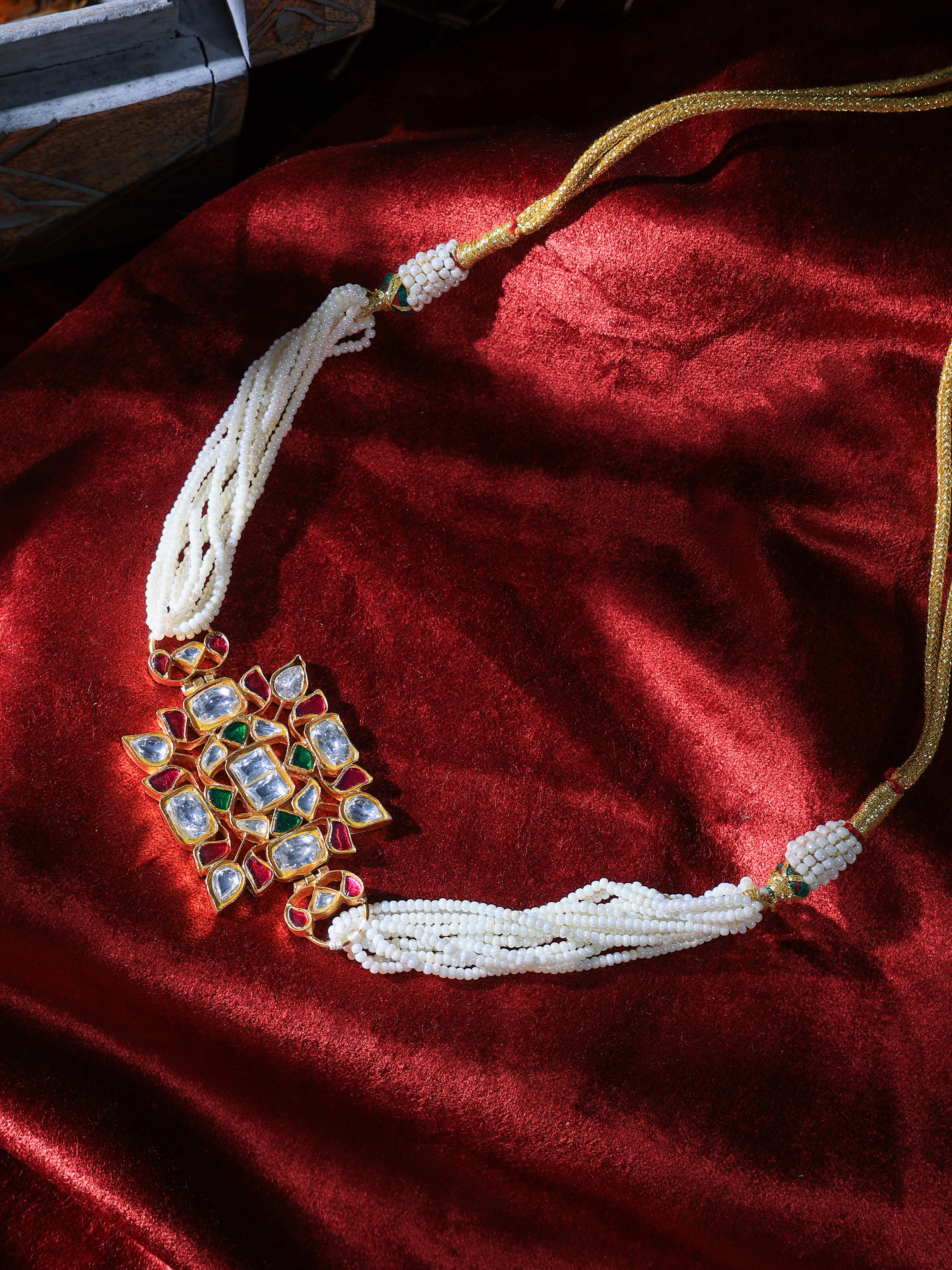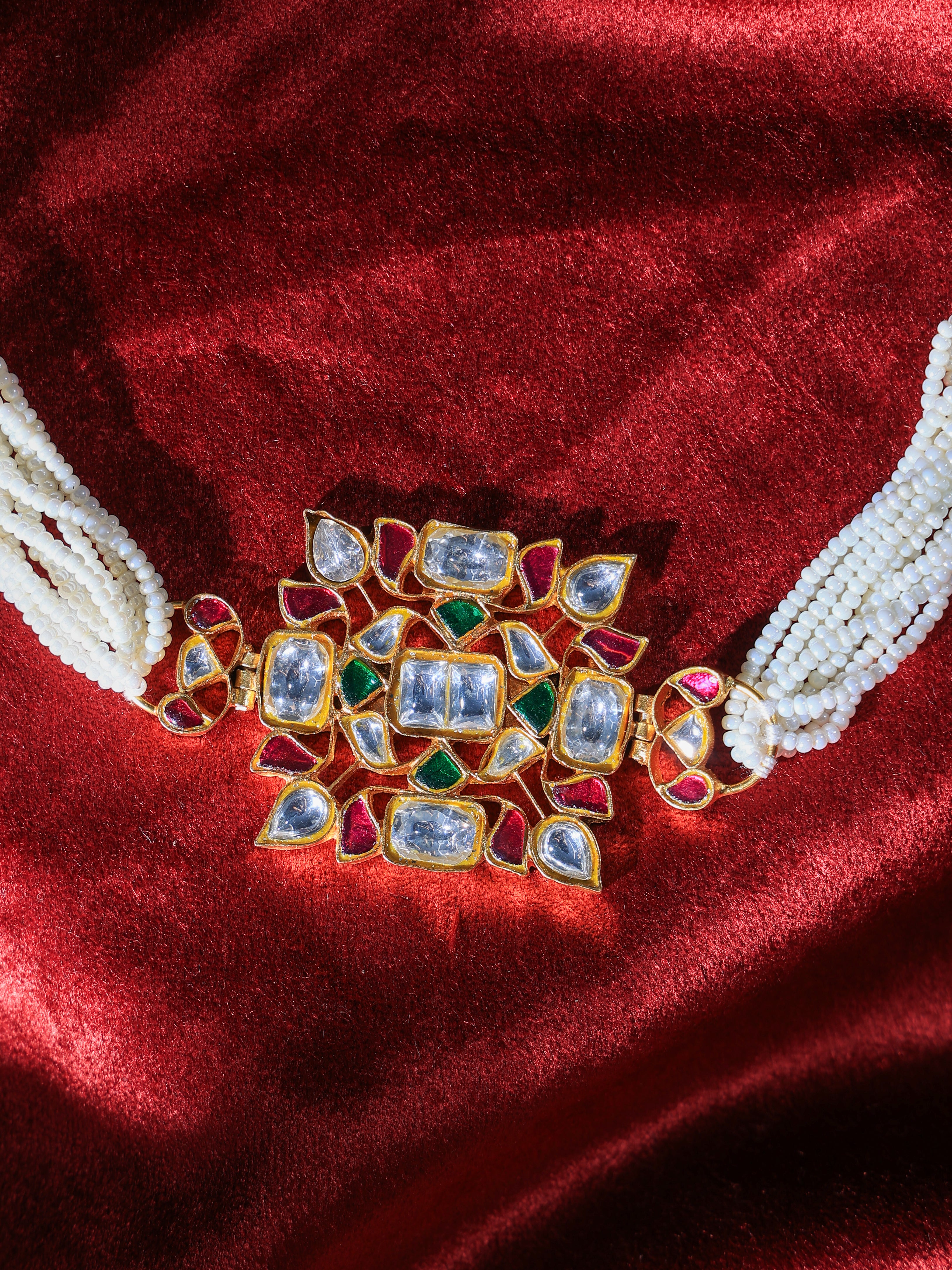 Featuring gold polished real Kundan choker in silver mixed with brass metal.Make a statement of timeless beauty with this exquisite Kundan choker, adorned with rich ruby red and elegant green stones. Crafted with traditional uncut Kundan work, this choker captures the essence of royal Indian jewellery—perfect for weddings, festive occasions, and grand celebrations.