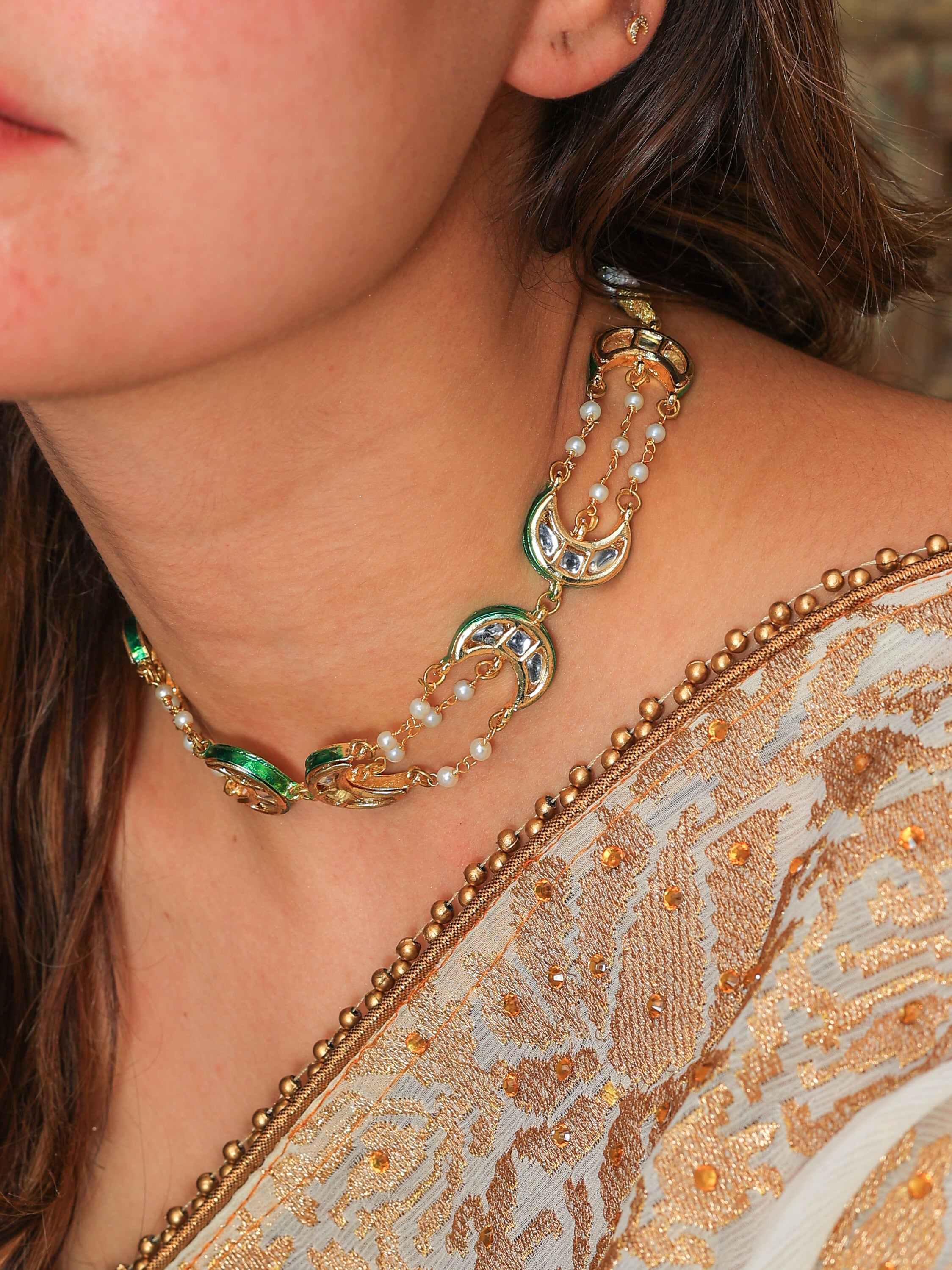 Make a bold yet graceful statement with this exquisite Chand Choker, inspired by traditional crescent moon motifs. Crafted with intricate detailing and a perfect blend of classic and contemporary styles, this choker sits elegantly around your neck, enhancing your ethnic or festive look.
