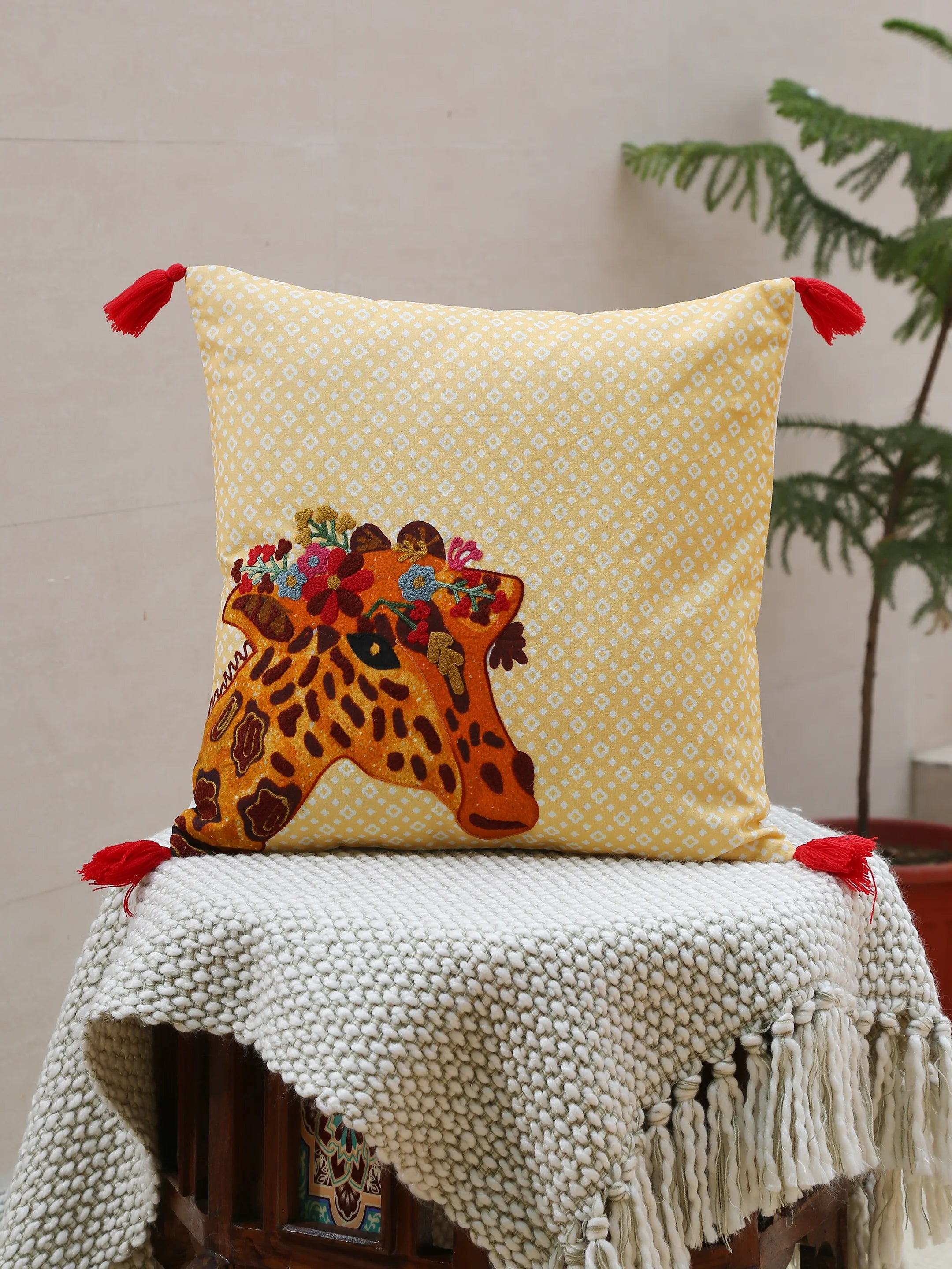 Add the quirky charm to your décor. Bring home this unique giraffe print cushion cover with beautiful flower embroidery. The uniqueness and playfulness of this vibrant cushion cover will make your décor pleasant and lively. Shop the entire collection to complete the look.