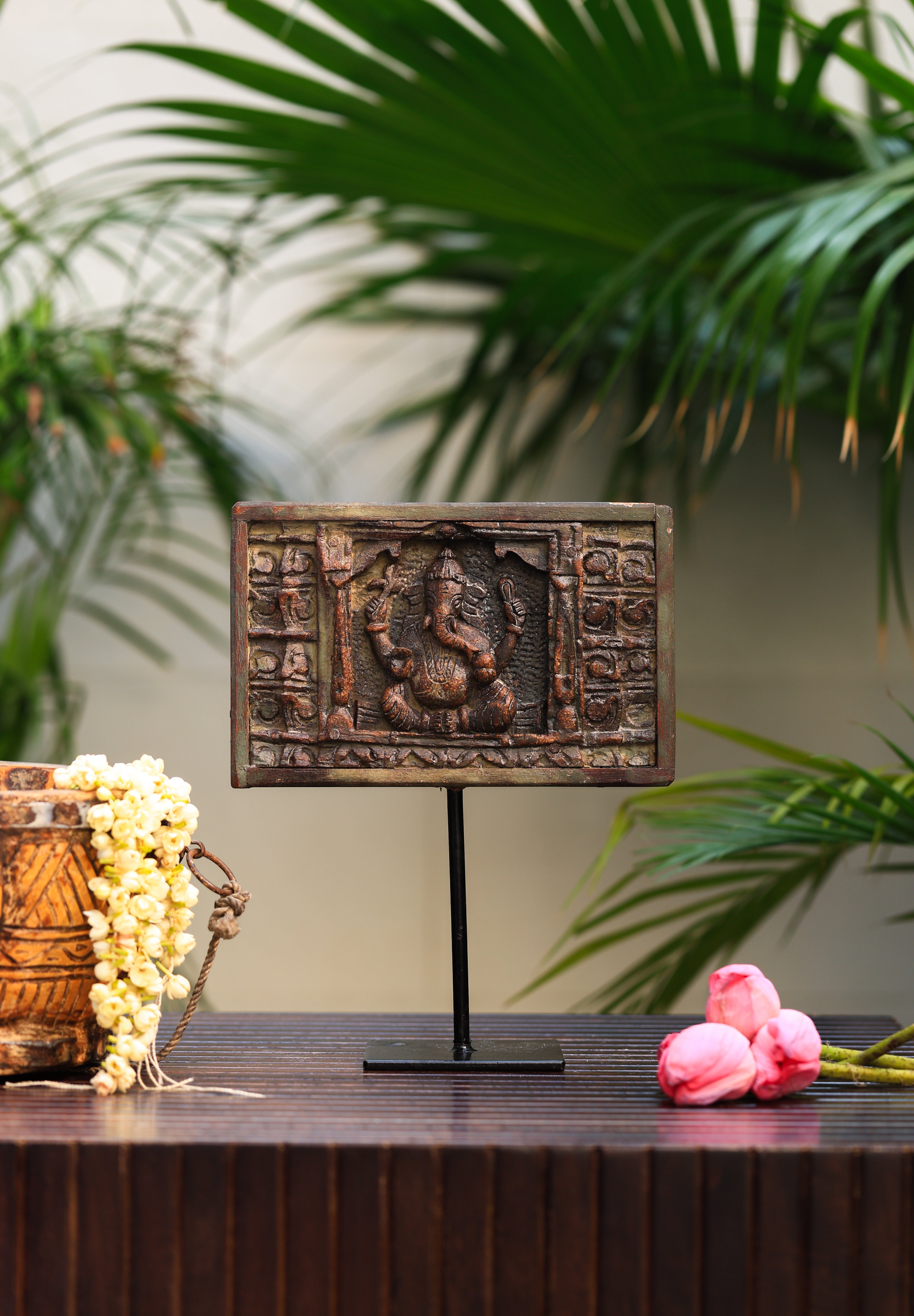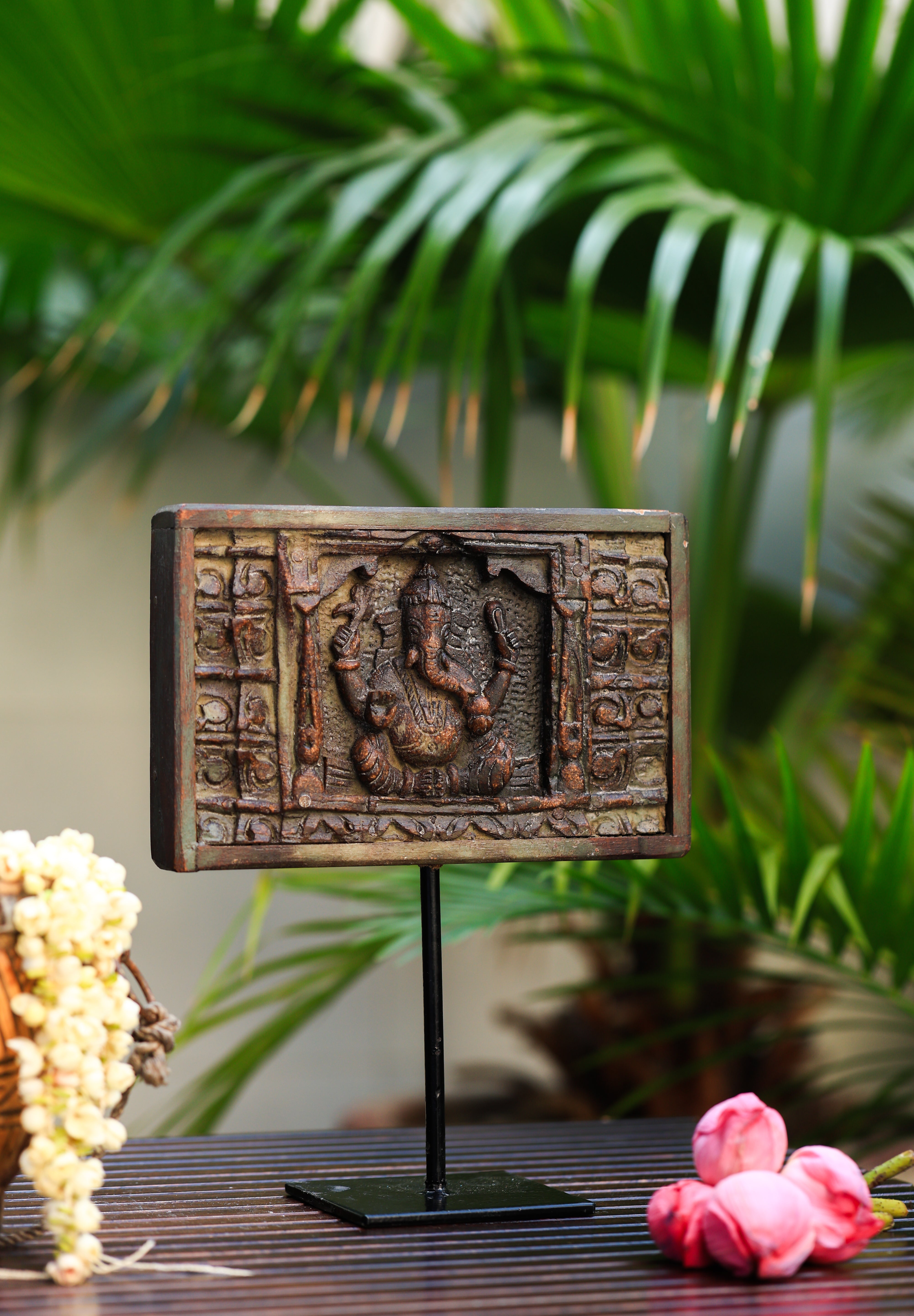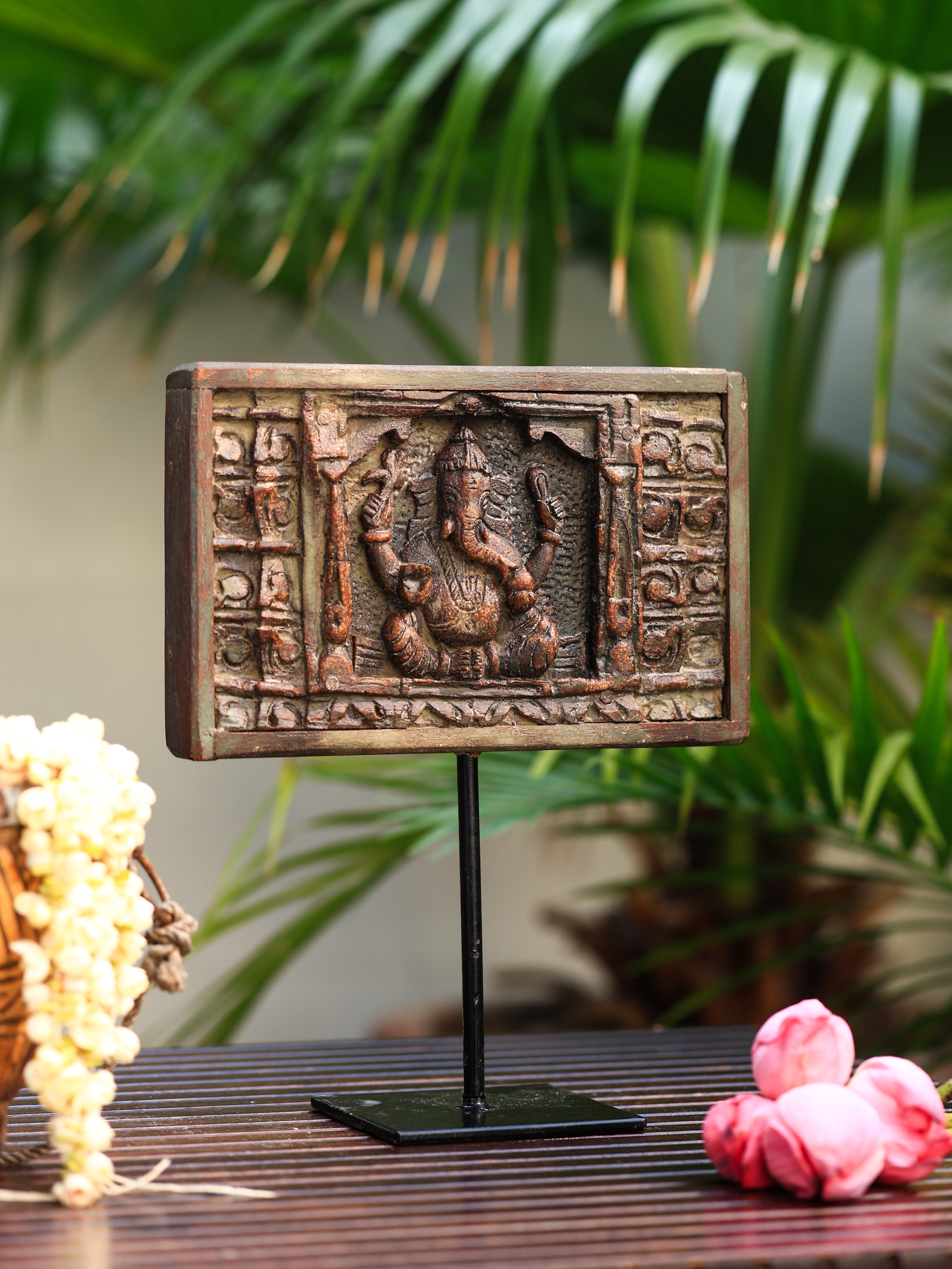 A vintage finish First God-Ganesha wooden panel on an iron stand is an elegant and spiritual piece of table decor. Crafted with intricate detailing, this wooden panel features a beautifully carved image of First God-Ganesha, the Hindu god of wisdom, prosperity, and remover of obstacles. The wood’s aged, antique finish enhances the traditional craftsmanship, while the sturdy iron stand offers a modern contrast, allowing the piece to stand tall and securely. This charming decor is perfect for adding a touch of spirituality, culture, and timeless elegance to any home or office space.