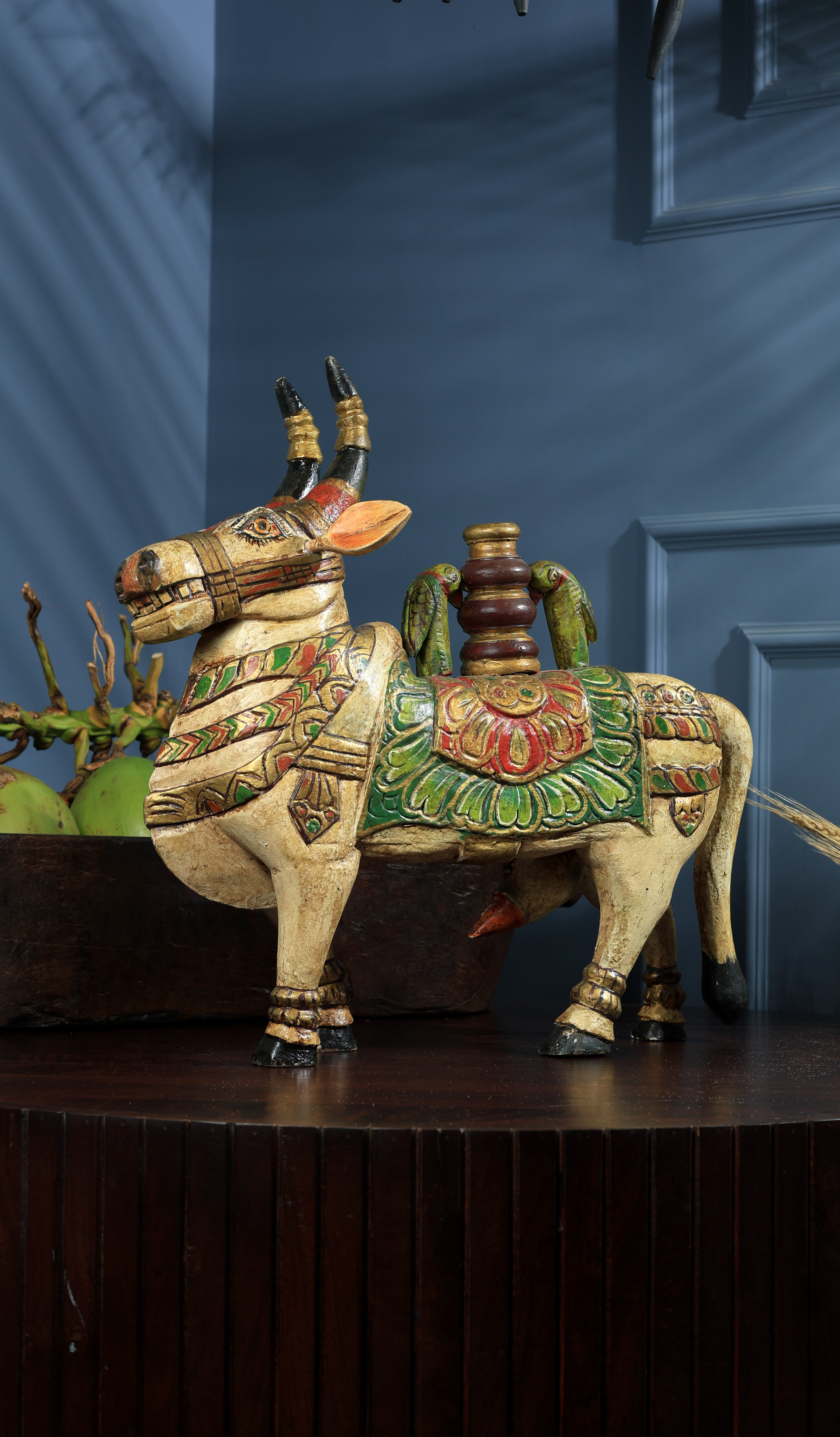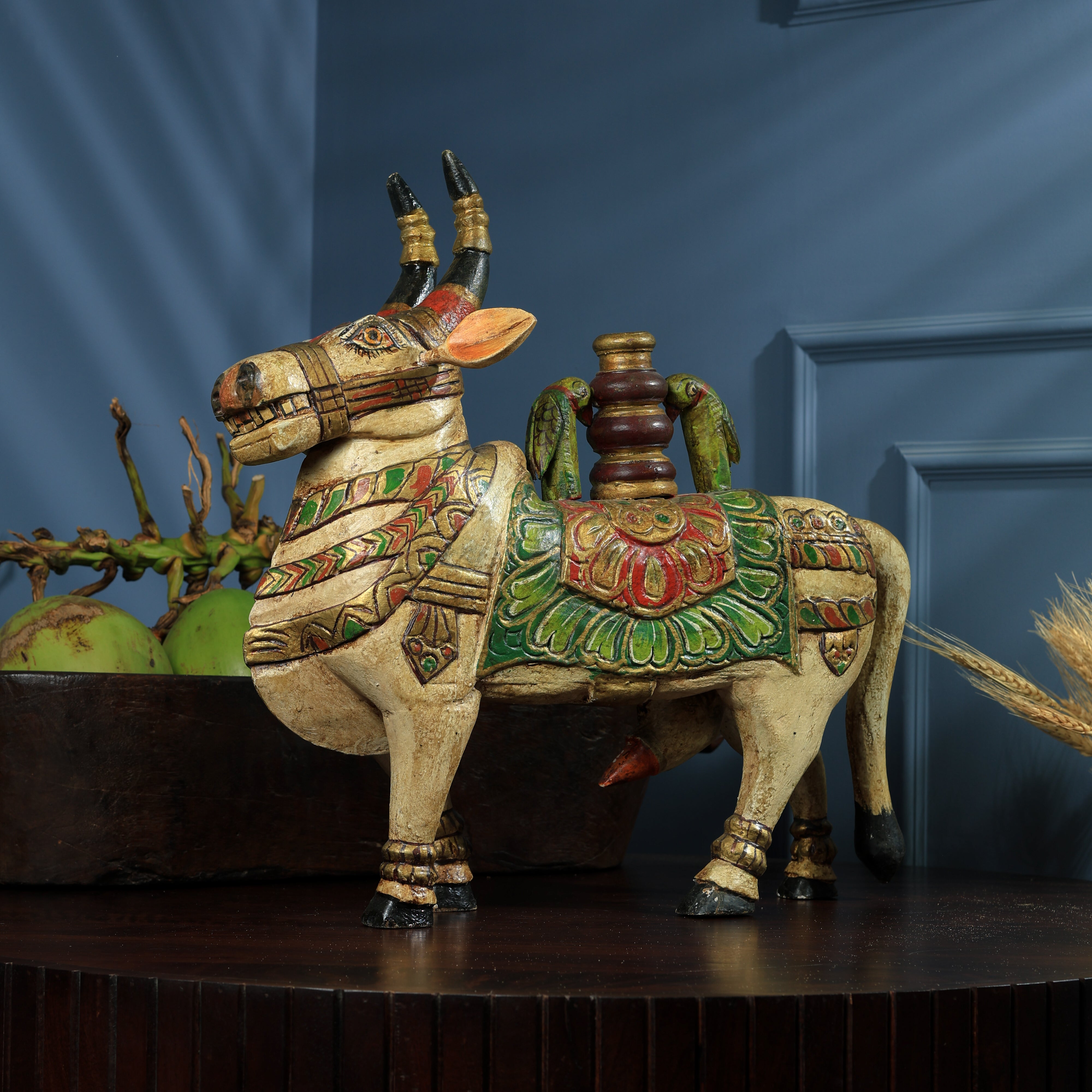 This carved wooden Nandi has been handcrafted and hand-painted by our artisans Nandi is the sacred white bull calf, gatekeeper, and vehicle (vahana) of Lord Shiva, it also symbolizes moral and religious duty, but also virility, fertility, and strength. This Nandi is beautifully decorated in colors of red green and gold.