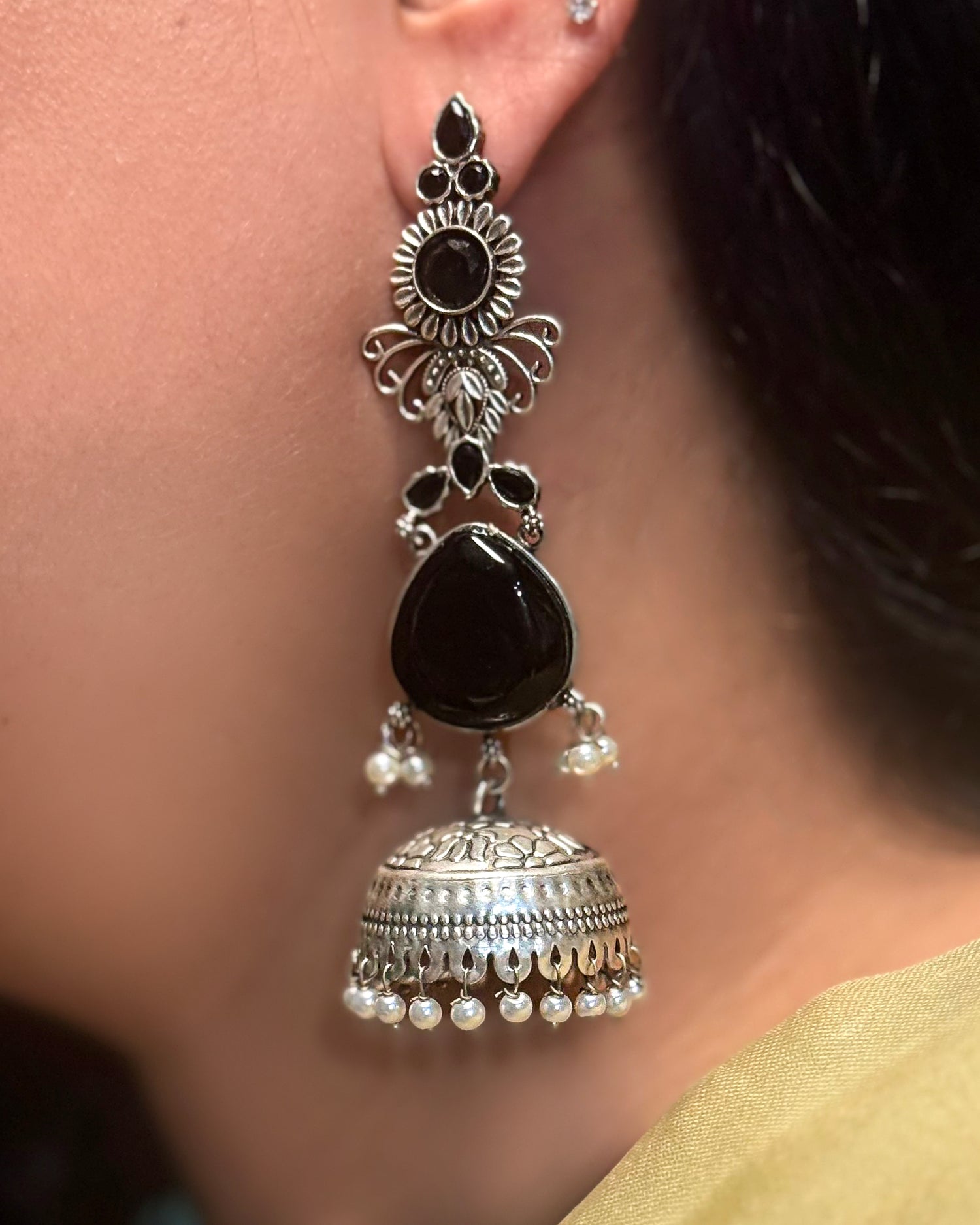 Elevate your ethnic style with these beautiful oxidised silver jhumki earrings, featuring intricate detailing and a sparkling stone accent. Lightweight, stylish, and perfect for festive or casual wear.