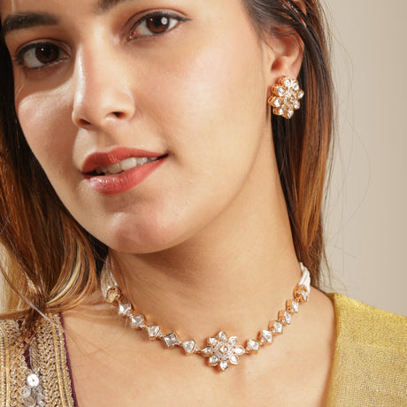 Rs. 2,400.00Unit price /UnavailableJuwayriya Floral Kundan Polki Gold-Tone Necklace & Stud Earrings Set