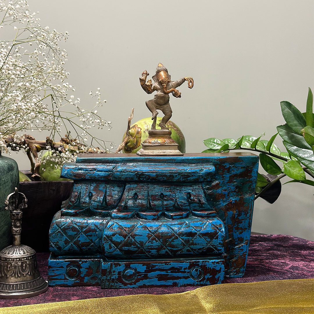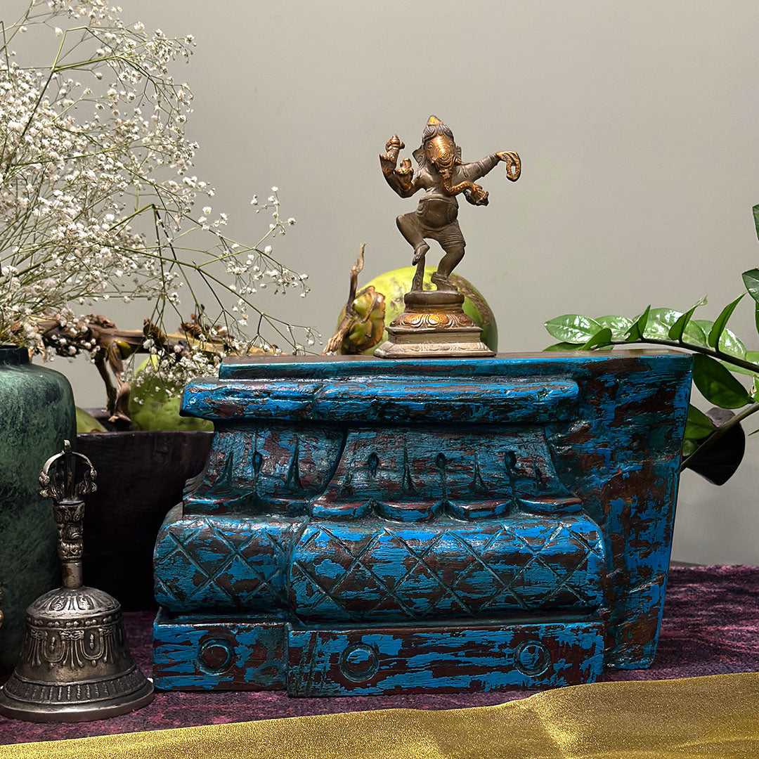 This hand carved wood block is remnant of old haveli or houses from western India These blocks feature ornamental elements that were carefully hand chiseled by a craftsman. This hand carved a stunning piece has been hand painted in beautiful punchy colors and can be used as ornamental element in any corner of house
