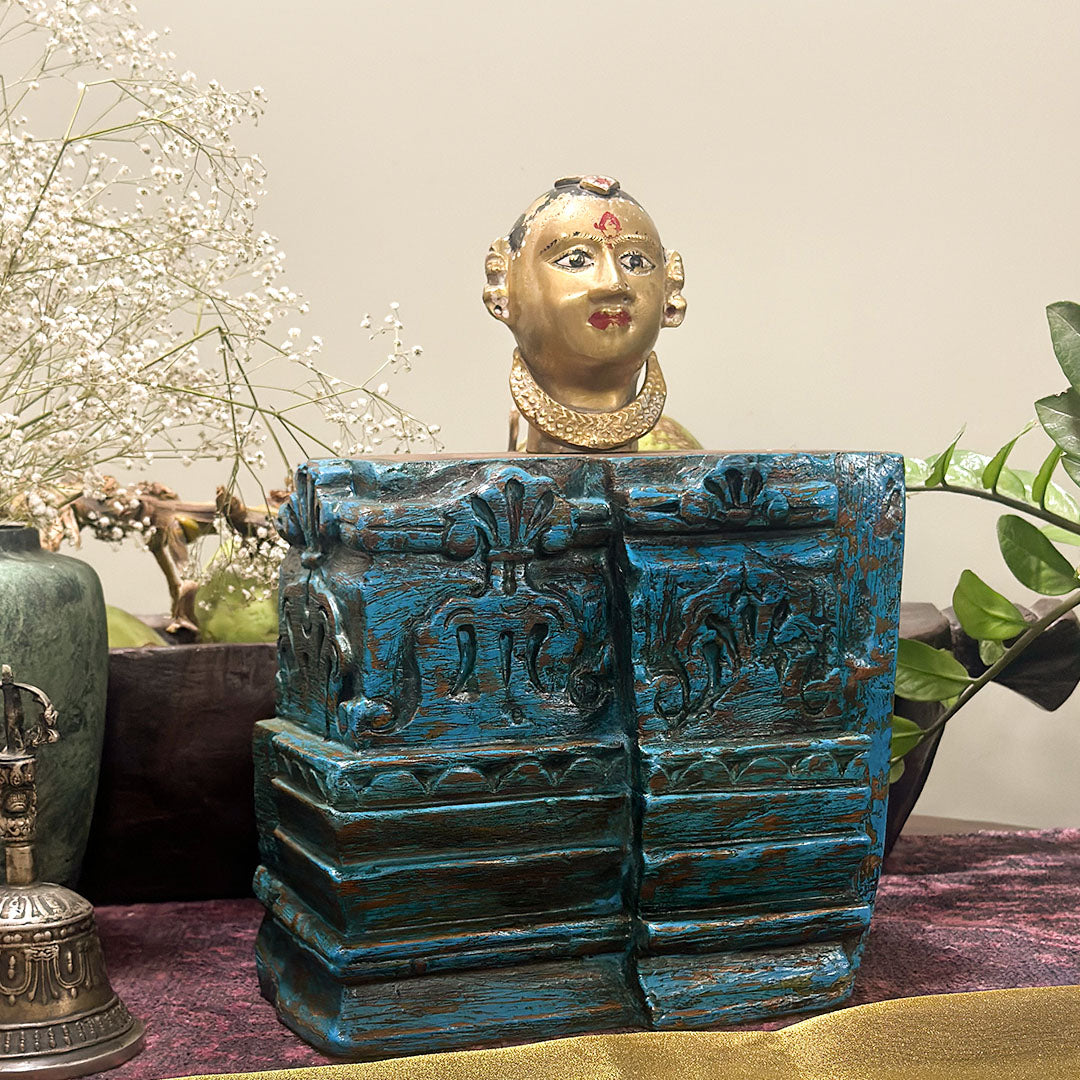 This hand carved wood block is remnant of old haveli or houses from western India These blocks features ornamental elements that were carefully hand chiseled by a craftsmen These hand carved a stunning piece has been handpainted in beautiful punchy colours and can be used as ornamental element in any corner of house
