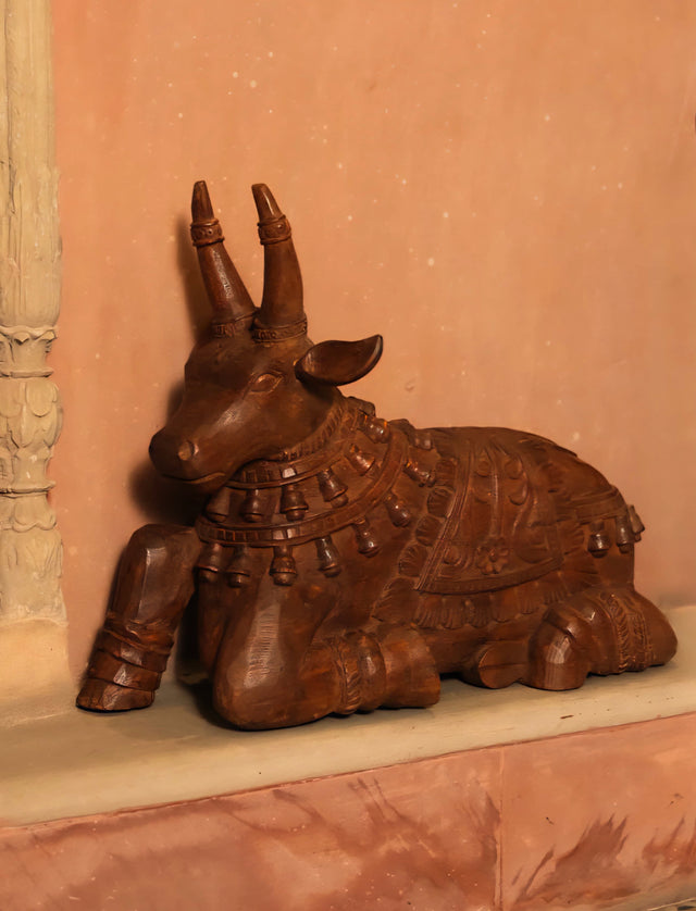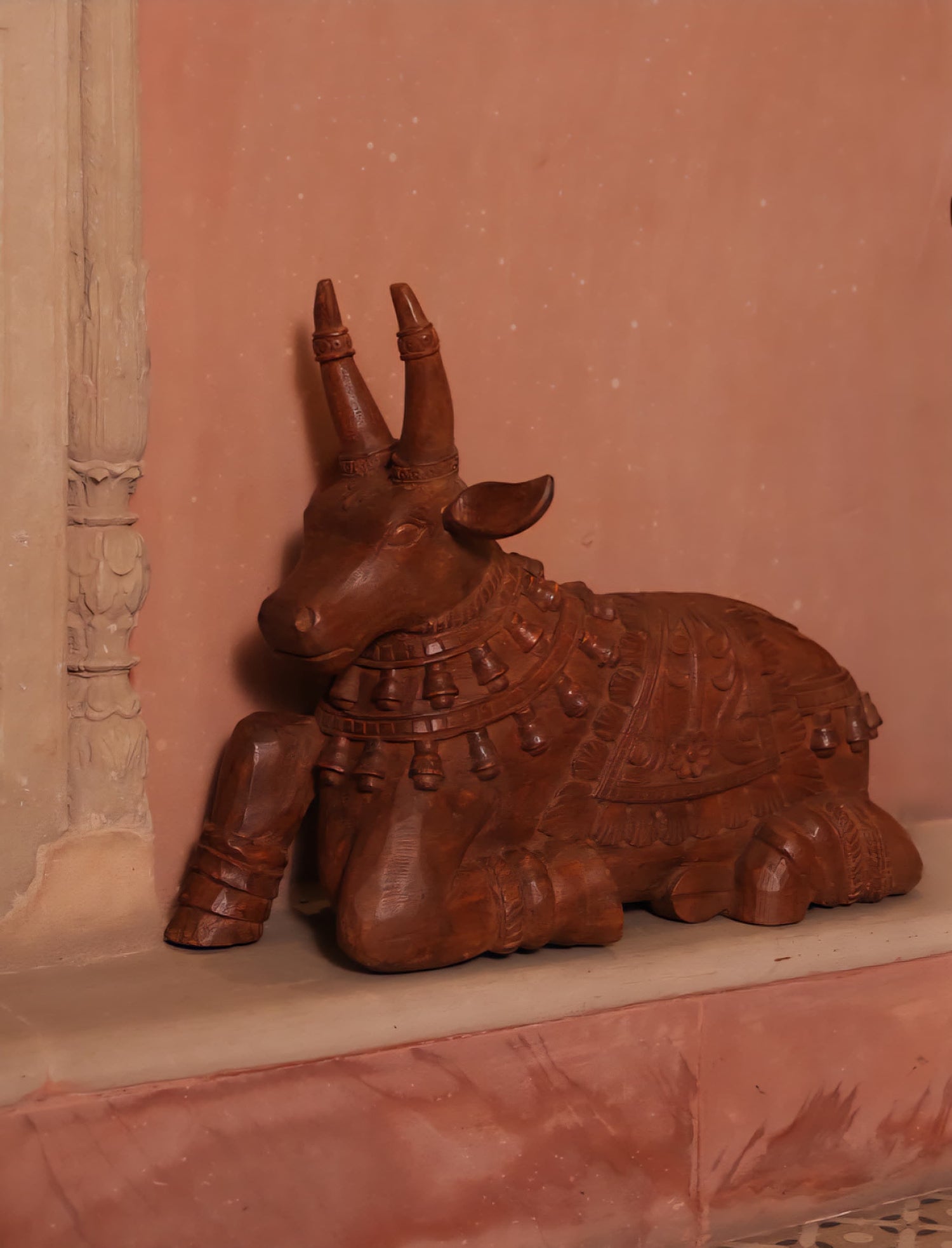painted by our artisans Nandi is the sacred white bull calf, gatekeeper, and vehicle (vahana) of Lord Shiva, it also symbolizes moral and religious duty, but also virility, fertility, and strength. This Nandi is beautifully decorated in colors of red green and gold. This Nandi has a beautiful bell on his neck adding beauty and charm to the product