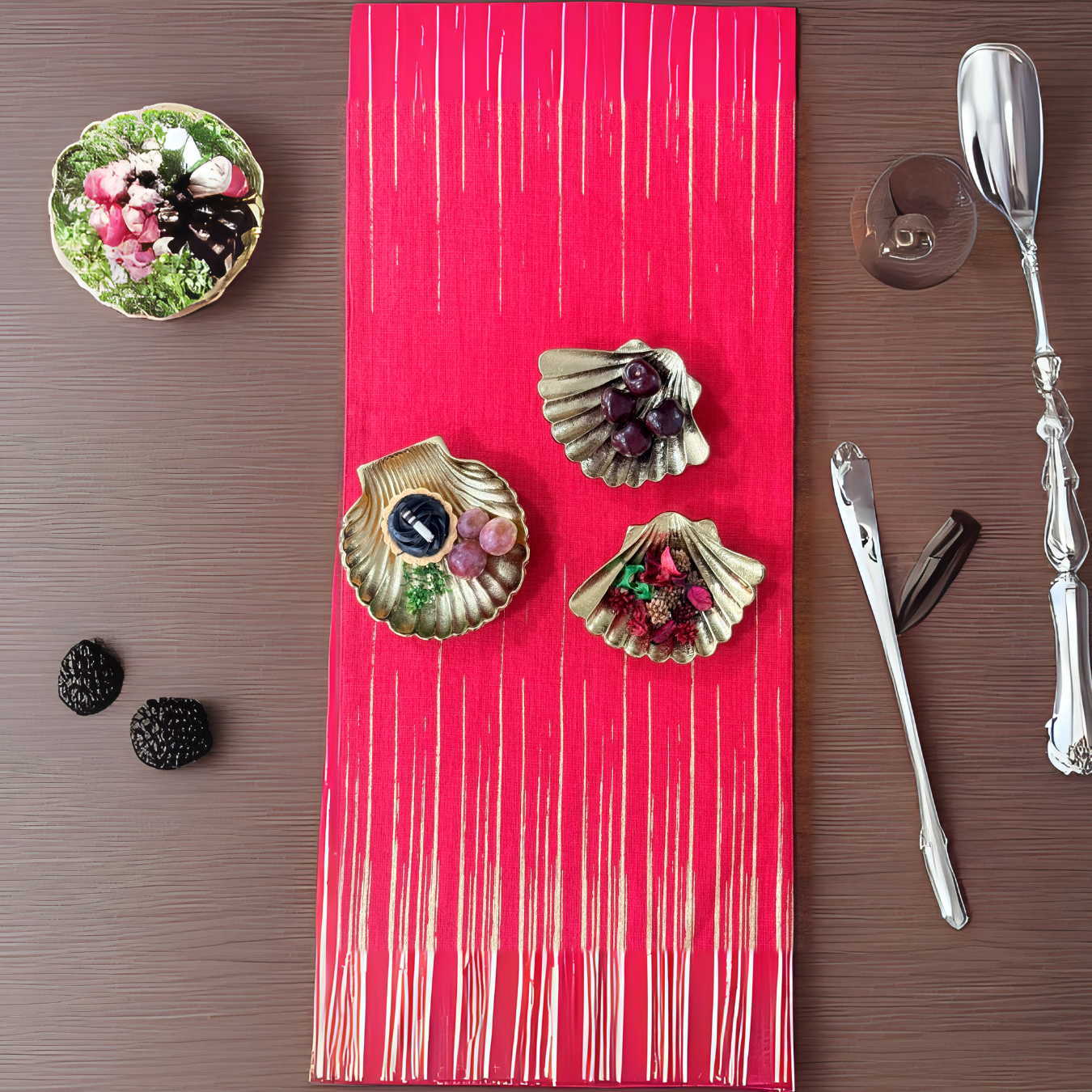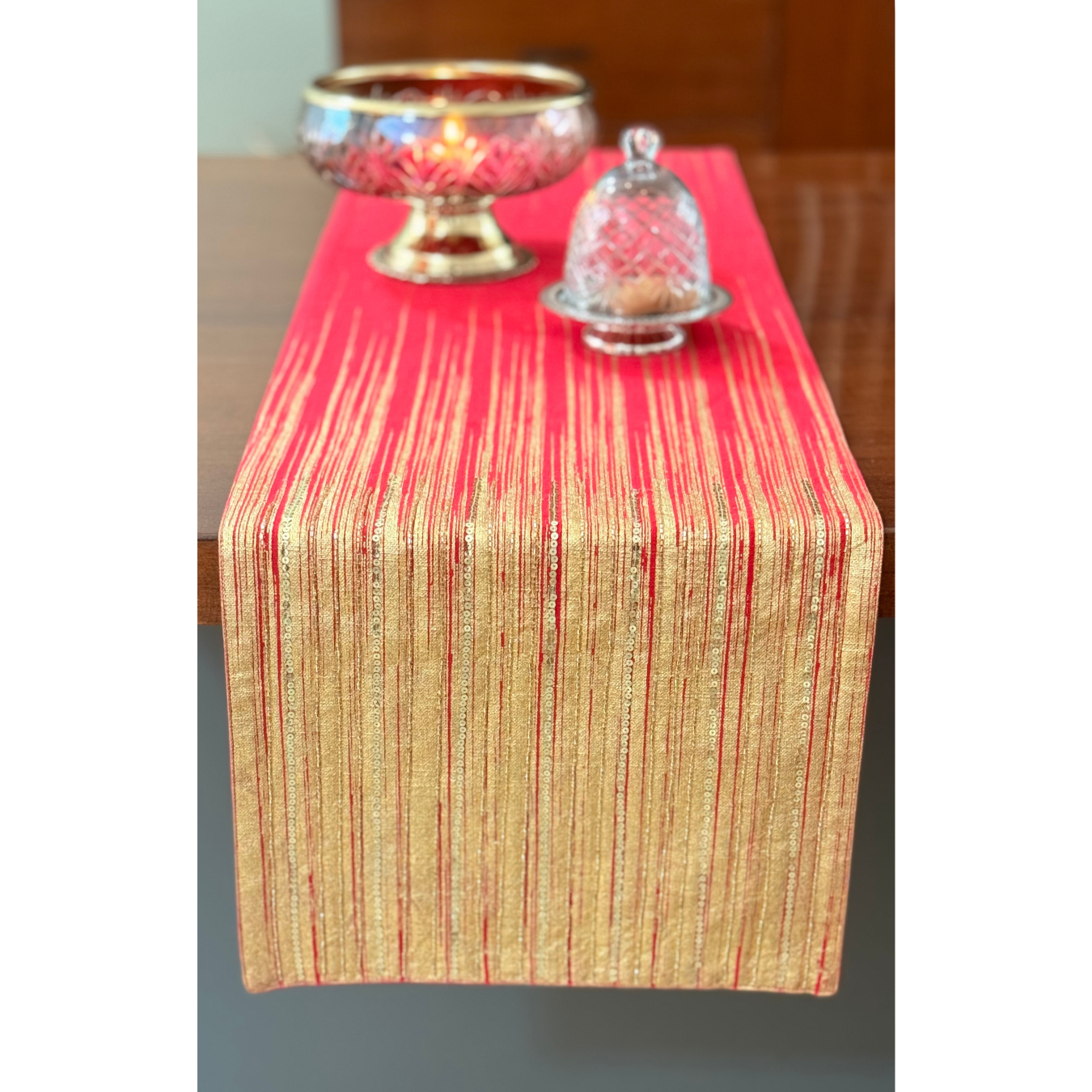 Make every celebration grand with our Red Runner adorned with Gold Foil and Beads. Rich in color and intricate in detailing, this runner instantly elevates your table setting with festive charm. The vibrant red base symbolizes joy and prosperity, while the golden accents and delicate beadwork add a luxurious touch. Perfect for festive gatherings, weddings, or as a thoughtful gift, it brings warmth, elegance, and sparkle to every occasion.