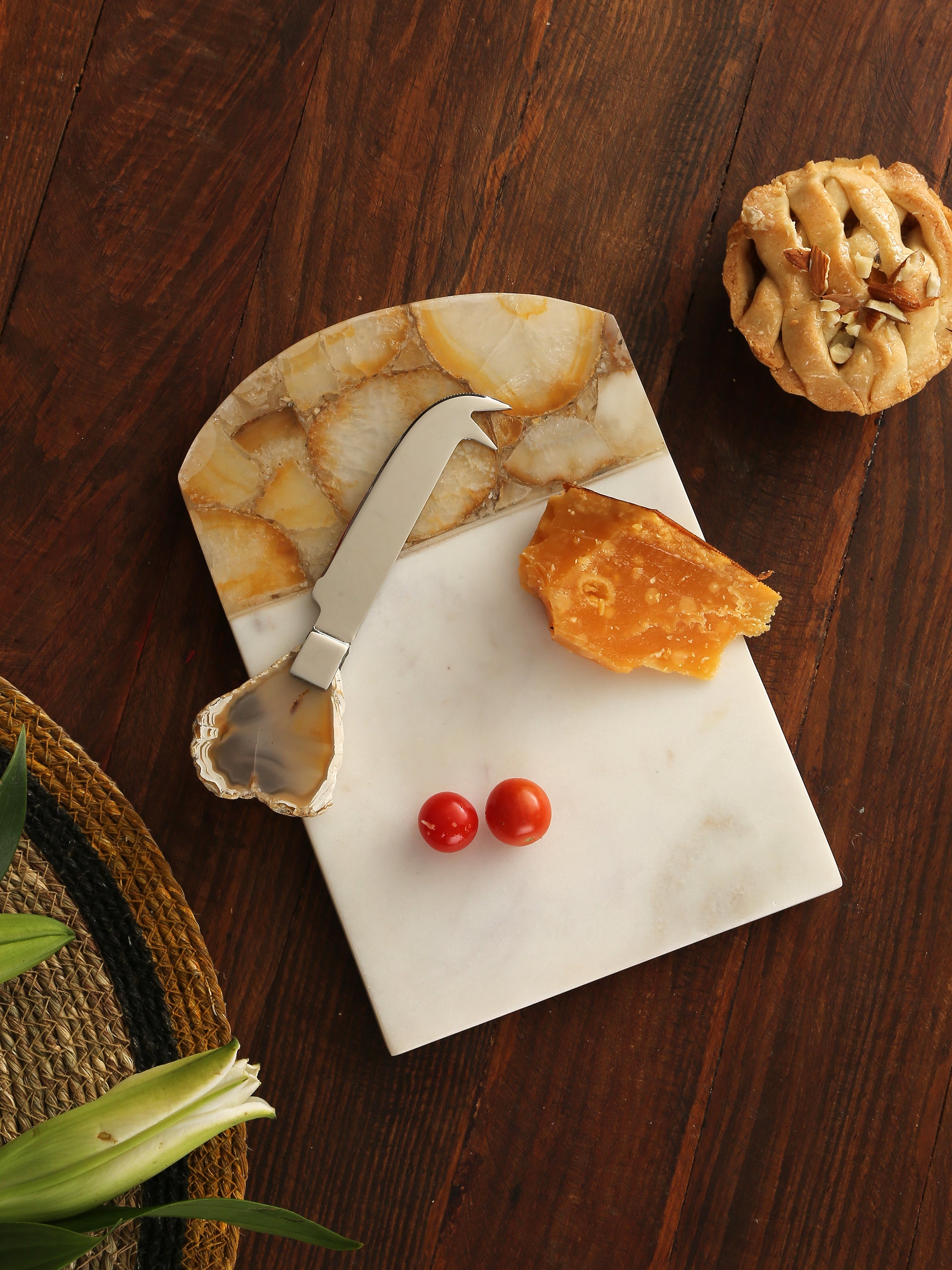 This marble board with an agate border and matching knife is a royal addition to your table and will add a unique charm to your servings. Ideal for festive gifting and special occasions.