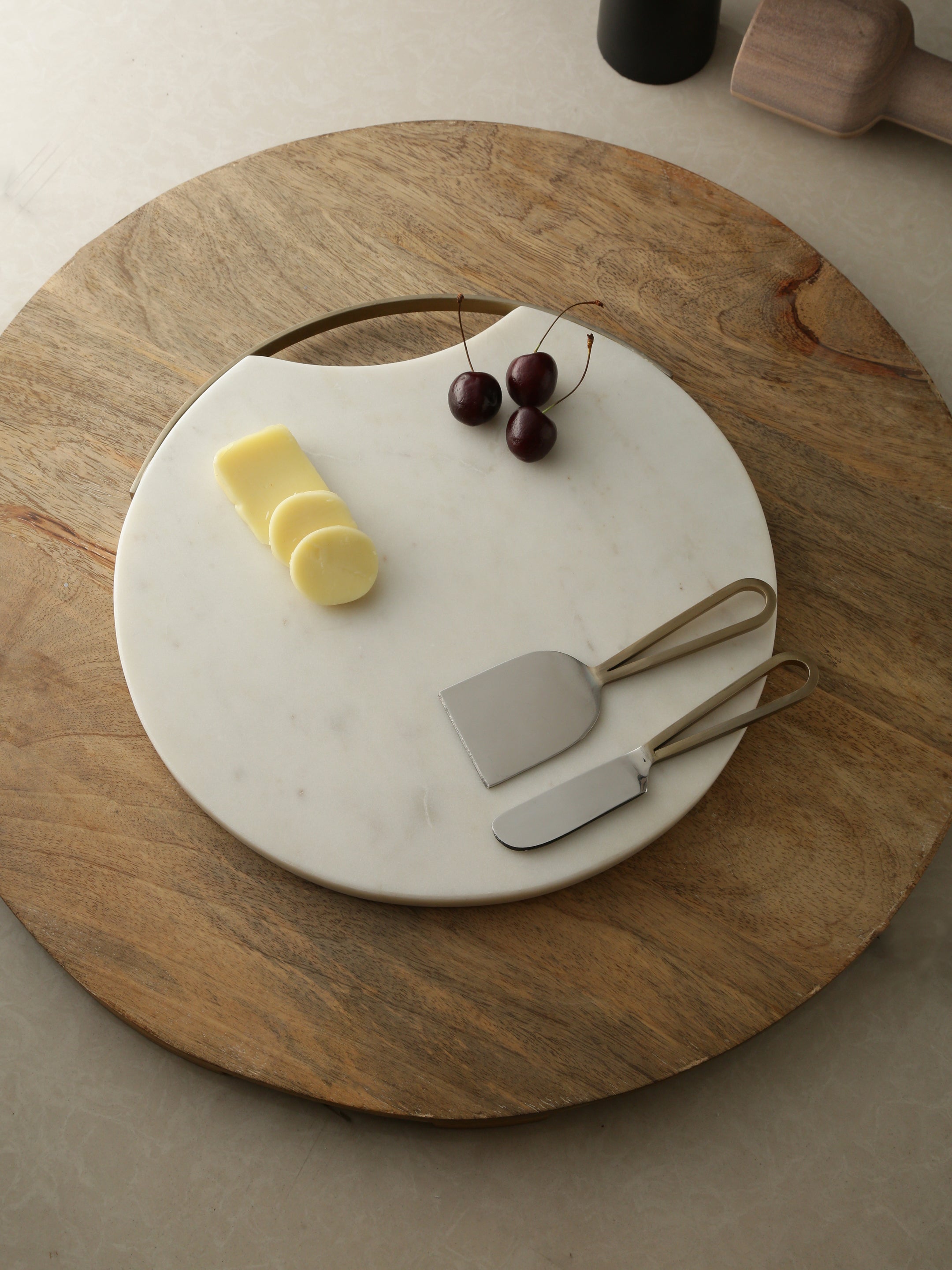 Chopping Board - Marble Cheese Board Cum Platter With Matt Gold Handle And Cheese Cutlery