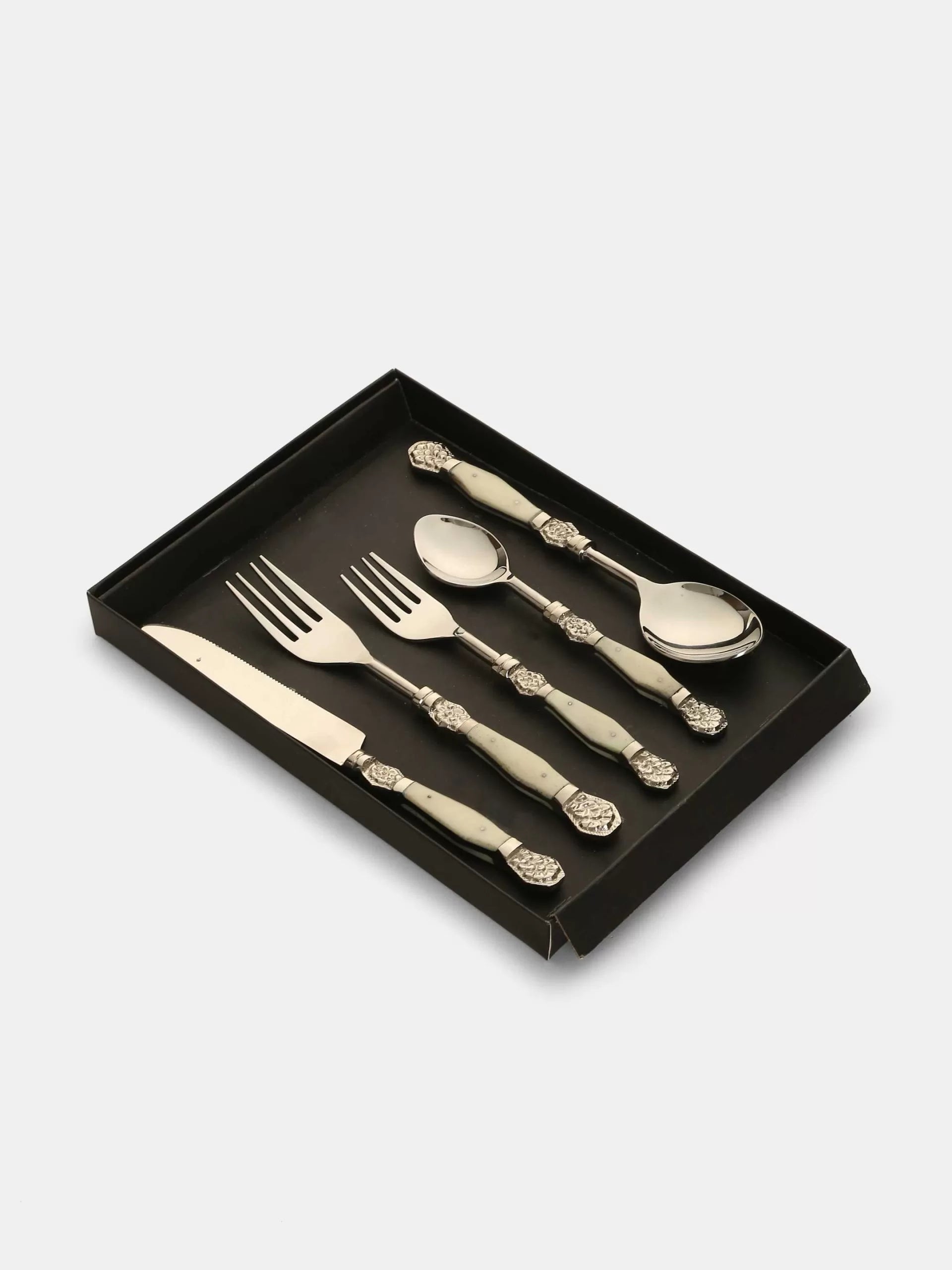All homes need a beautiful cutlery set to give their guests  luxurious dining experience. This unique set with embossing and natural bone is a must have piece for your collection.