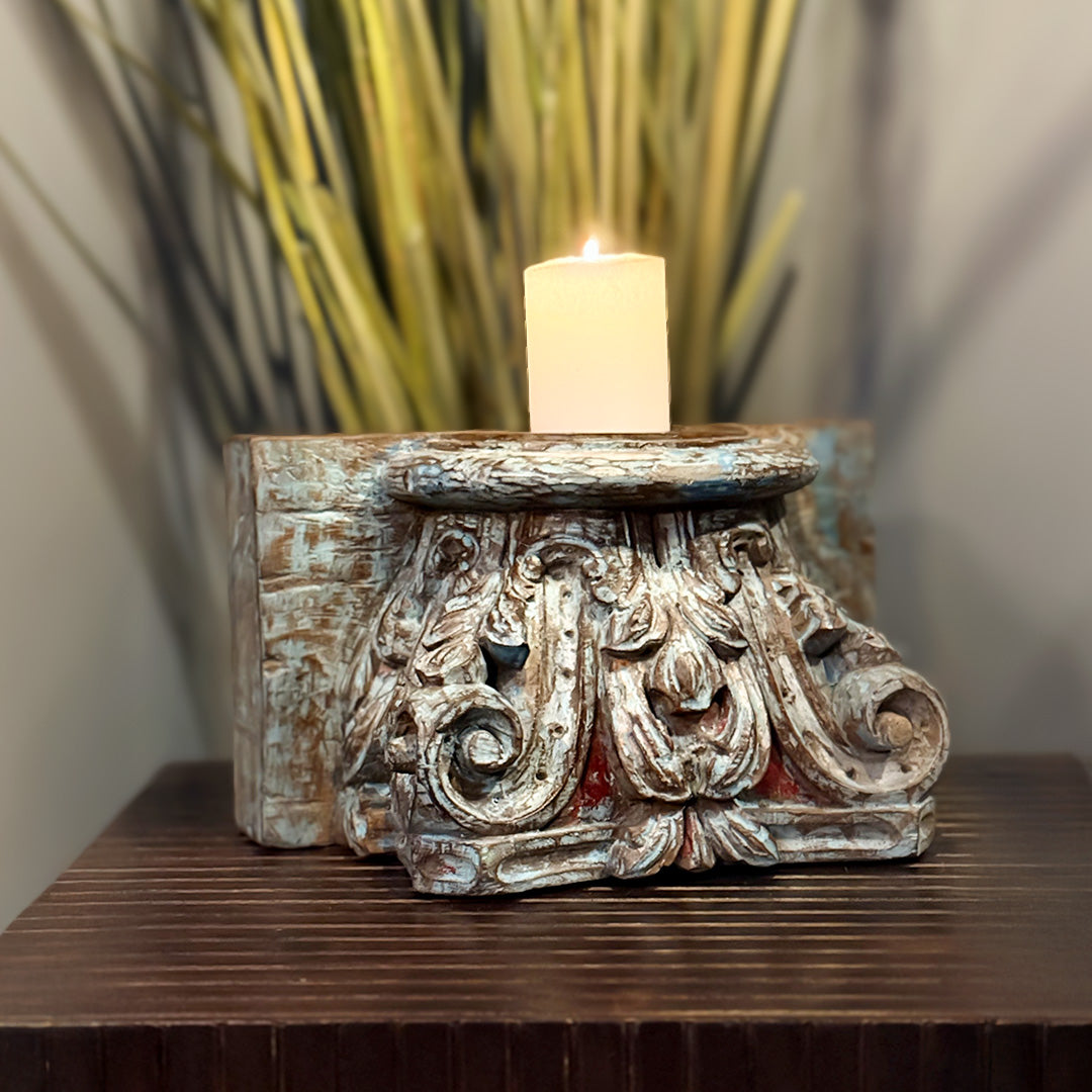 This artistic Candle holder is recreated from vintage wood This is a genuine reclaimed wood piece and has been ageing and hence have this rustic characteristic and does not look brand new Take your pick from our assorted mix of vintage and collectible candle holders