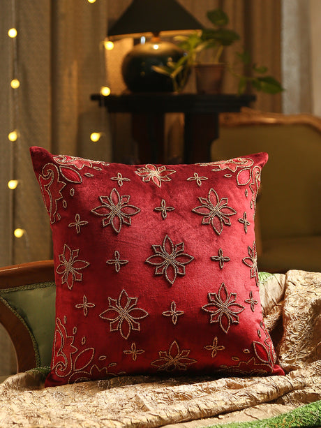 Extensive Zari embroidered cushion cover with hand bead work in Burgundy Viscose Velvet