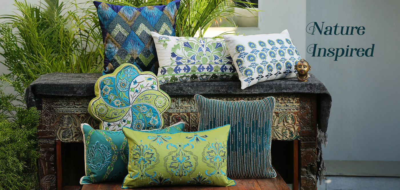 Nature Inspired- Off-White Cushion Cover with Blue and Green Motifs