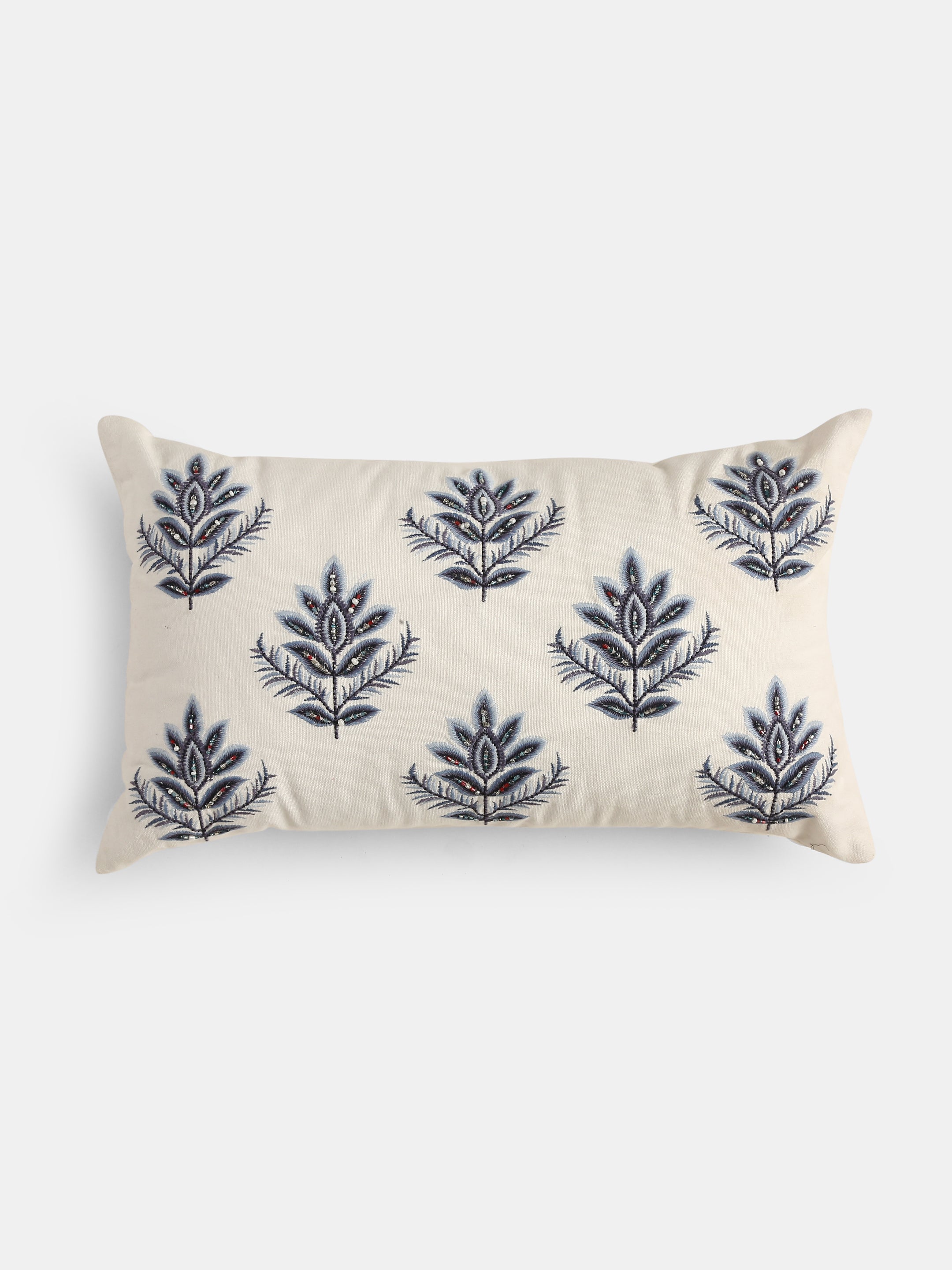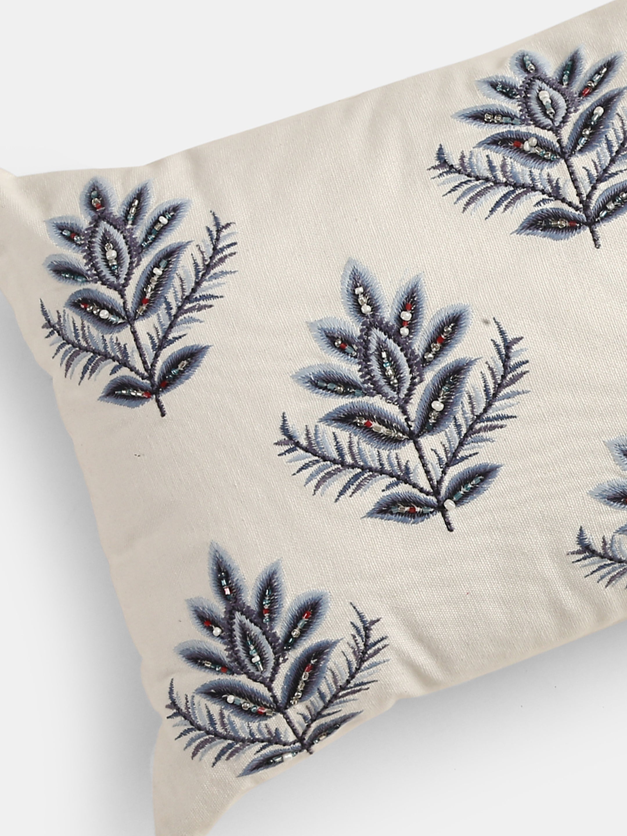 This beautifully embroidered and hand beaded cushion cover in blue adds vibrance to your spaces. Add this with velvet and tufted cushion covers from this collection to display the richness of layering textures.