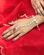 This elegant hand harness beautifully blends traditional craftsmanship with modern grace. Featuring a striking ruby-red statement stone on the finger ring and a delicate chain lined with shimmering polki-style crystals, this piece adds instant sophistication to any festive or bridal ensemble. Perfect for women who love refined, eye-catching jewelry.
