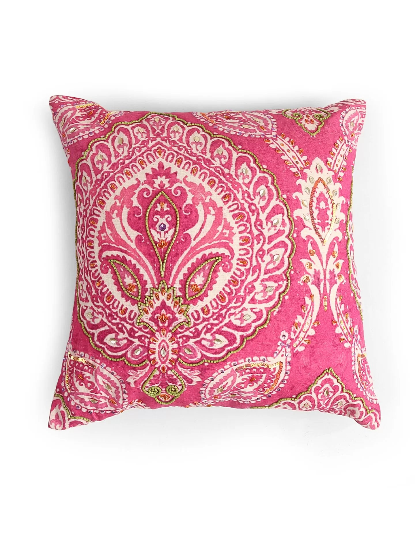 This beautiful cushion cover is vibrant and is a feast for eye with its stunning colors and extensive beadwork to enhance the design. This summer let your space exuberate vibrance and color. Bring home this beautiful cushion cover and add the entire collection to make your spaces beautifully colorful.