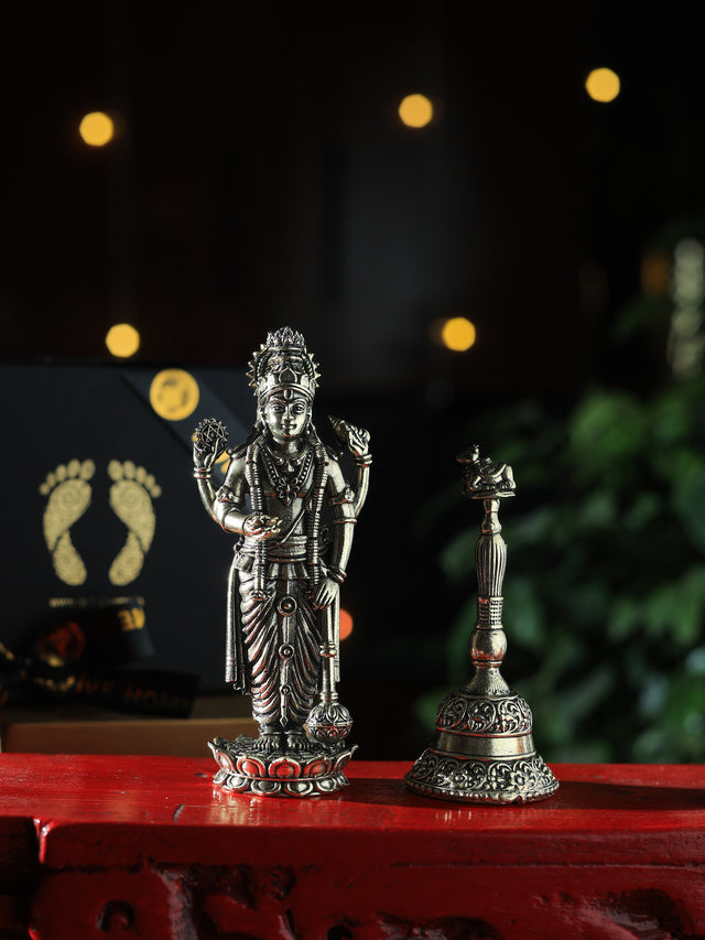 Bring home divine grace with the Shubh Narayan Set, featuring a beautifully crafted idol of Lord Vishnu along with a sacred Nandi Bell. Lord Vishnu, the preserver and protector of the universe, symbolizes prosperity, harmony, and balance, while the Nandi bell’s resonant sound purifies the surroundings and invites positivity. Perfect for daily puja, festive rituals, or as a thoughtful spiritual gift, this set carries blessings of protection, peace, and auspiciousness into every home.