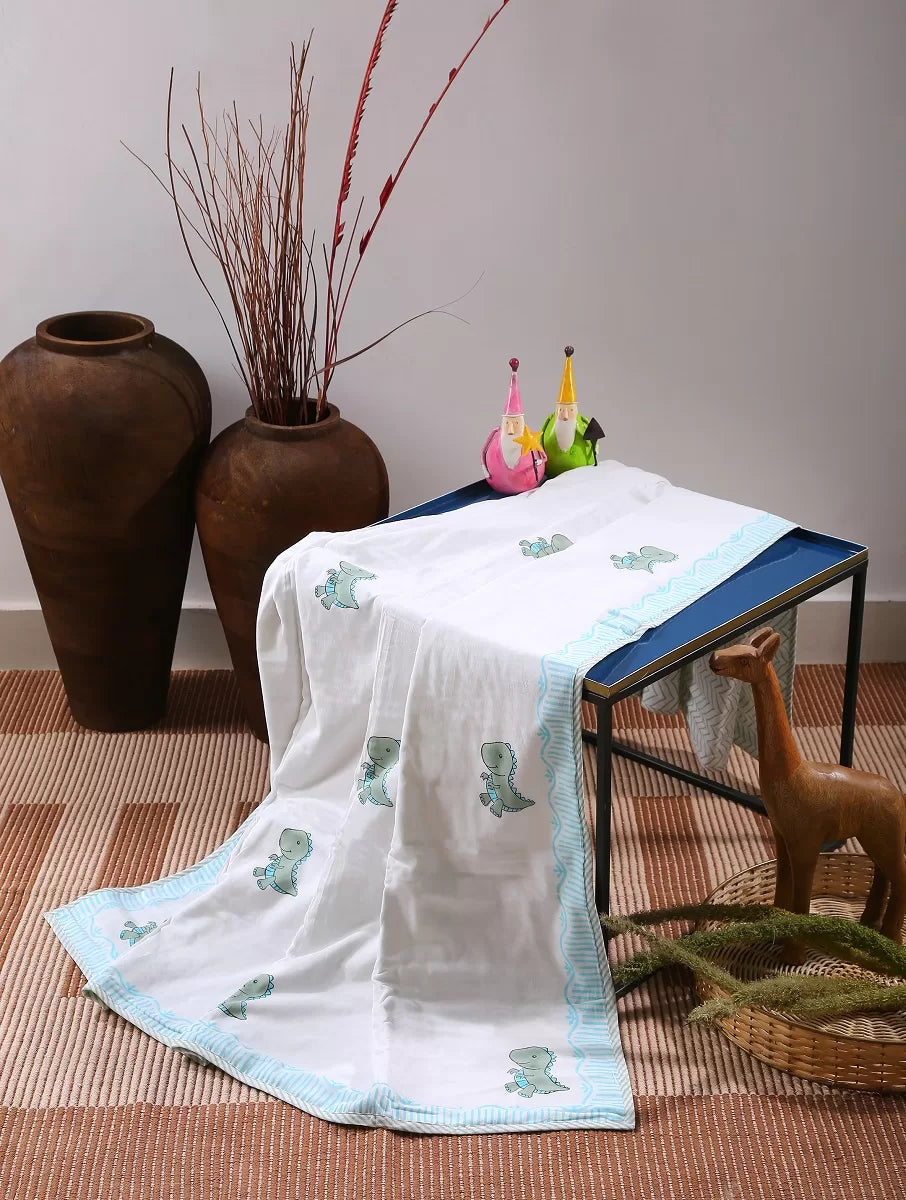 Our Reversible Baby Dohar with rabbit pattern has a hand-drawn feel that gives it a truly artistic touch. Adorned with of green Dinosaur and beautiful striped trim, each motif appears to be hand painted against the solid white background. And, since it's made from 100% cotton, the unimaginable softness and comfiness is basically a work of art . Just right for your baby.