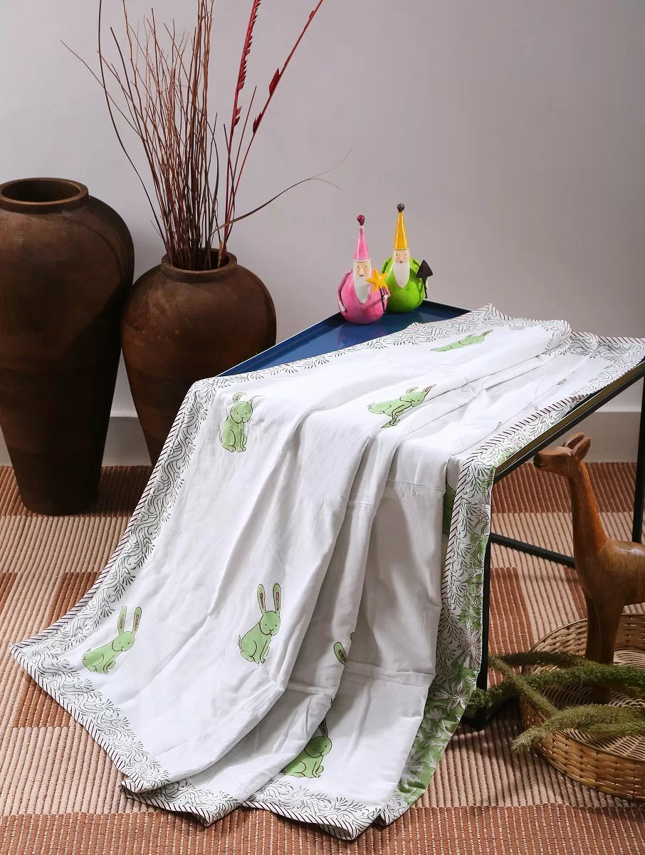 Our Reversible Baby Dohar with rabbit pattern has a hand-drawn feel that gives it a truly artistic touch. Adorned with of green Dinosaur and beautiful striped trim, each motif appears to be hand painted against the solid white background. And, since it's made from 100% cotton, the unimaginable softness and comfiness is basically a work of art . Just right for your baby .