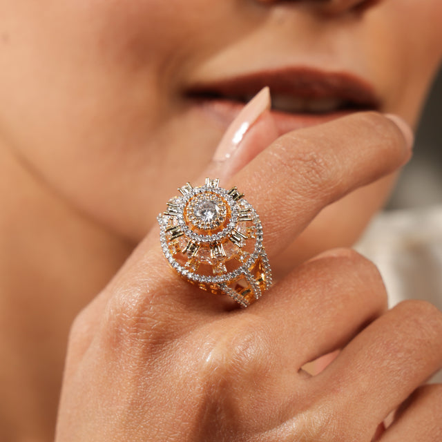 The Golden Radiance Diamond Halo Statement Ring features a brilliant round center stone surrounded by layered diamond-like halos in an elegant gold-tone setting. Designed for a bold and luxurious look, this ring is perfect for weddings, parties, and special occasions.