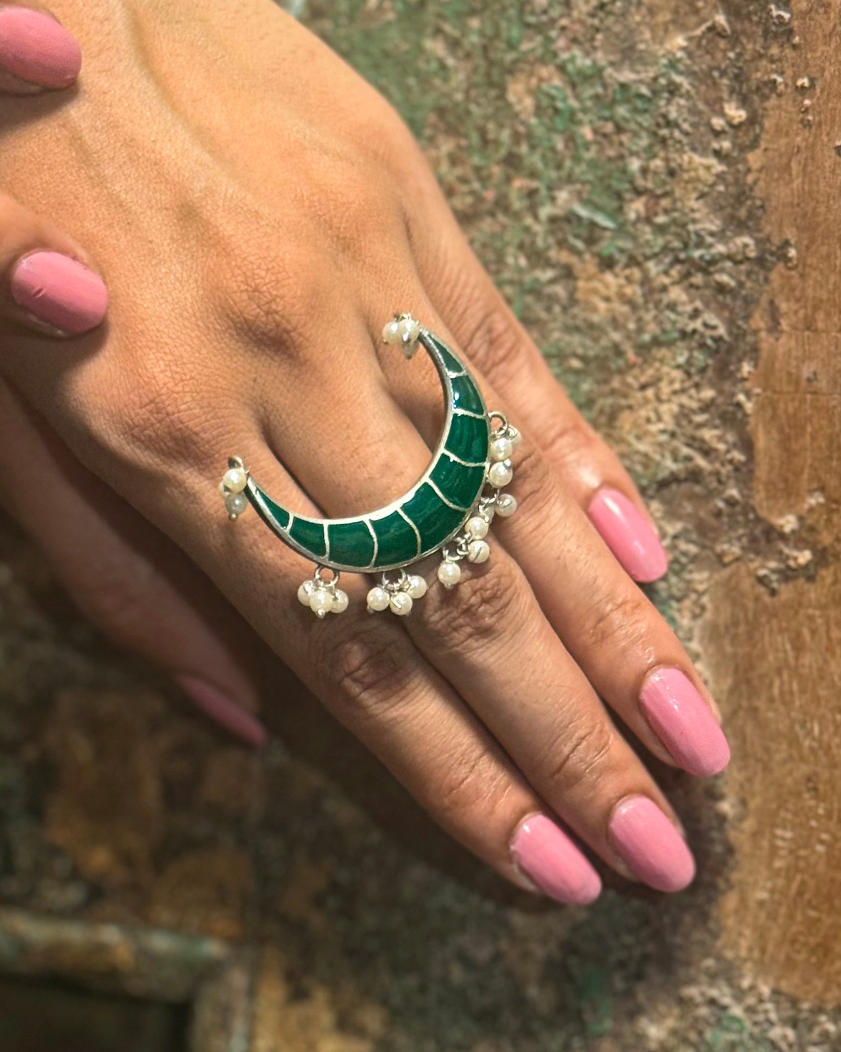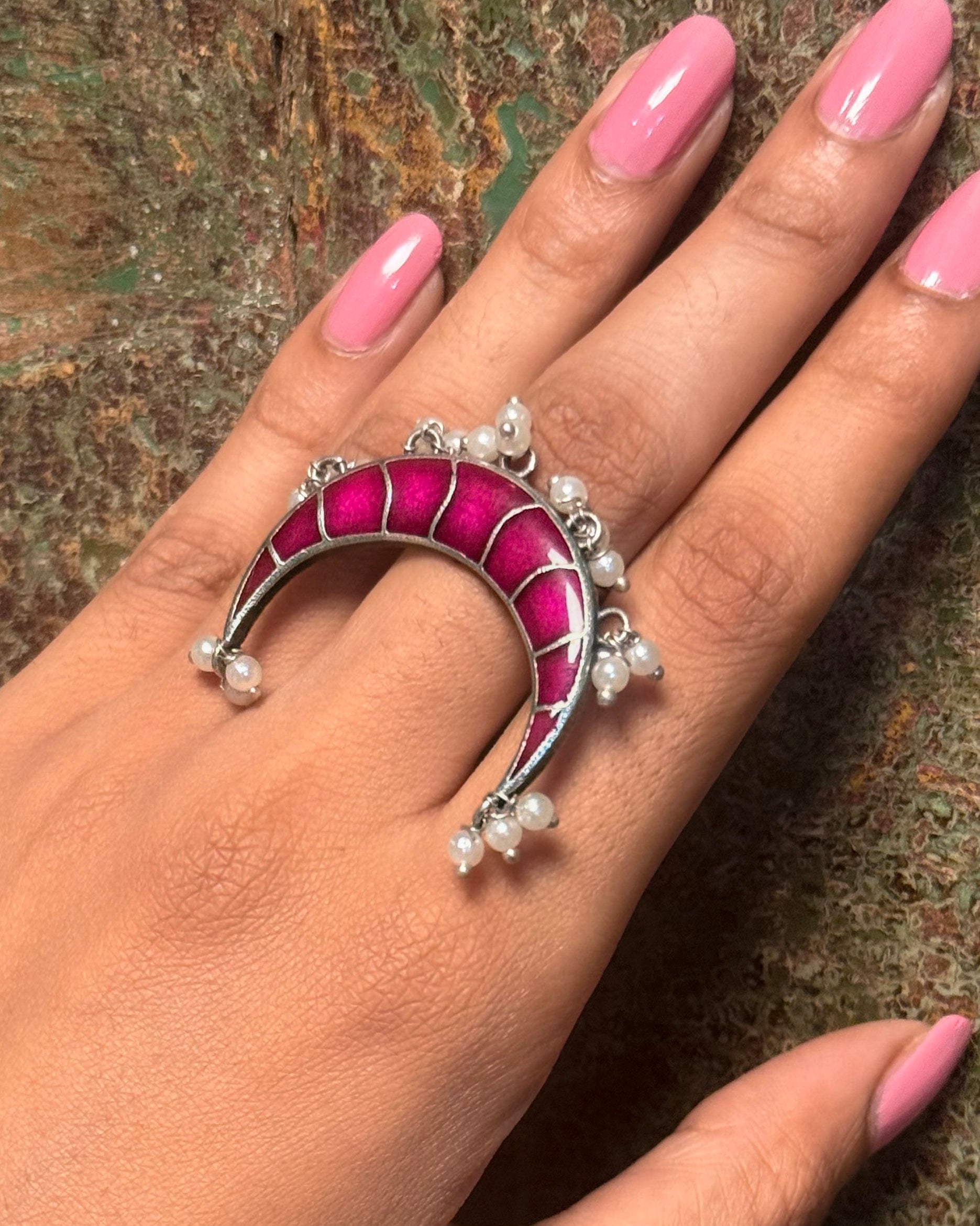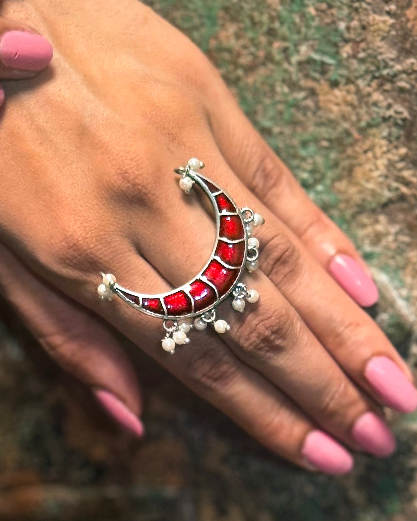 This oxidised silver  ring features a pretty artificial stone and detailed design. It’s stylish and great for adding an ethnic touch to any outfit.