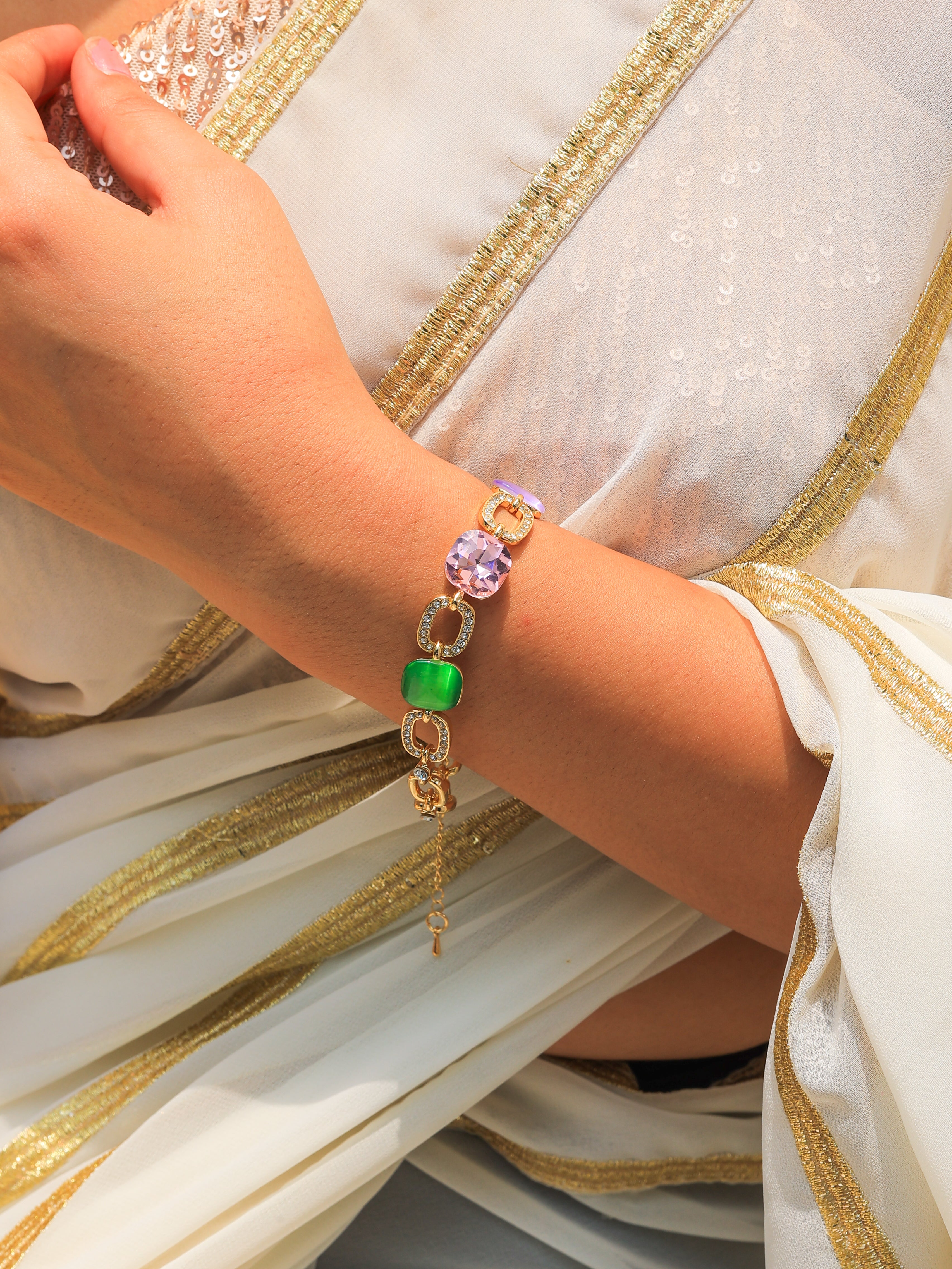 Introducing the Mona Lisa bracelet — a delicate blend of artistry and charm, adorned with enchanting mauve and green stones. Inspired by timeless beauty, this bracelet showcases a harmonious play of soft hues, adding a touch of sophistication and grace to any look. Whether worn for a festive occasion or to elevate everyday style, the Mona Lisa bracelet is a captivating accessory that embodies elegance in every detail.
