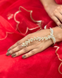 This exquisite floral hand harness (hathphool) is designed to bring effortless elegance to any traditional or modern outfit. Featuring a sparkling vine of diamond-style stones that gracefully connects a delicate ring to a curved wrist cuff, this piece adds a luxurious and feminine touch. Perfect for weddings, festive events, and special celebrations.