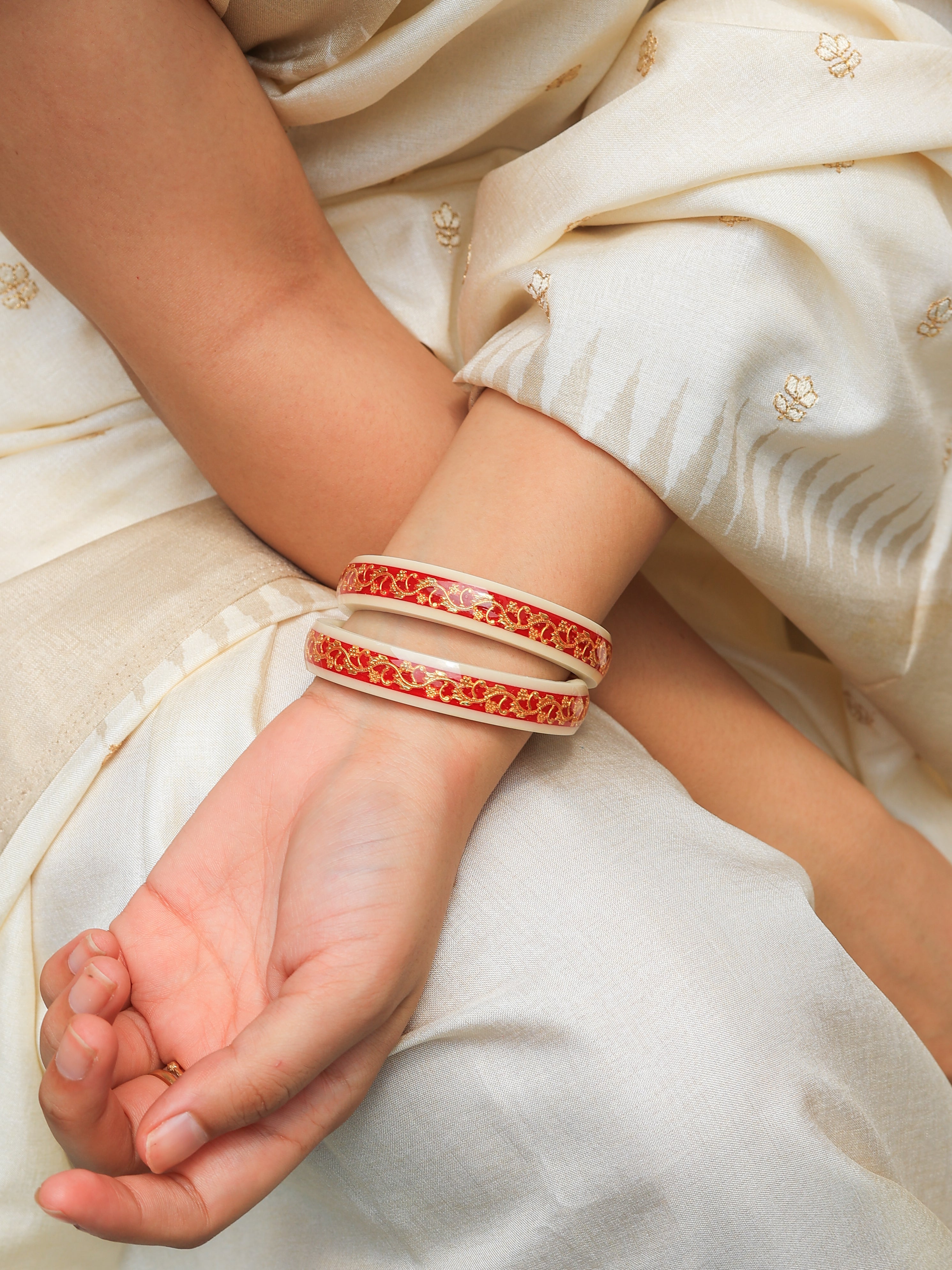 Rooted in tradition and crafted with elegance, this Red Sakha Pola Bangle features intricate gold flower jali work that adds a regal touch to its rich, vibrant hue. A symbol of cultural pride and timeless beauty, this bangle is perfect for weddings, festivals, and traditional ceremonies. The detailed gold floral design enhances its classic appeal, making it a striking statement piece that pairs beautifully with ethnic wear. Celebrate heritage with grace and sophistication in every wear.