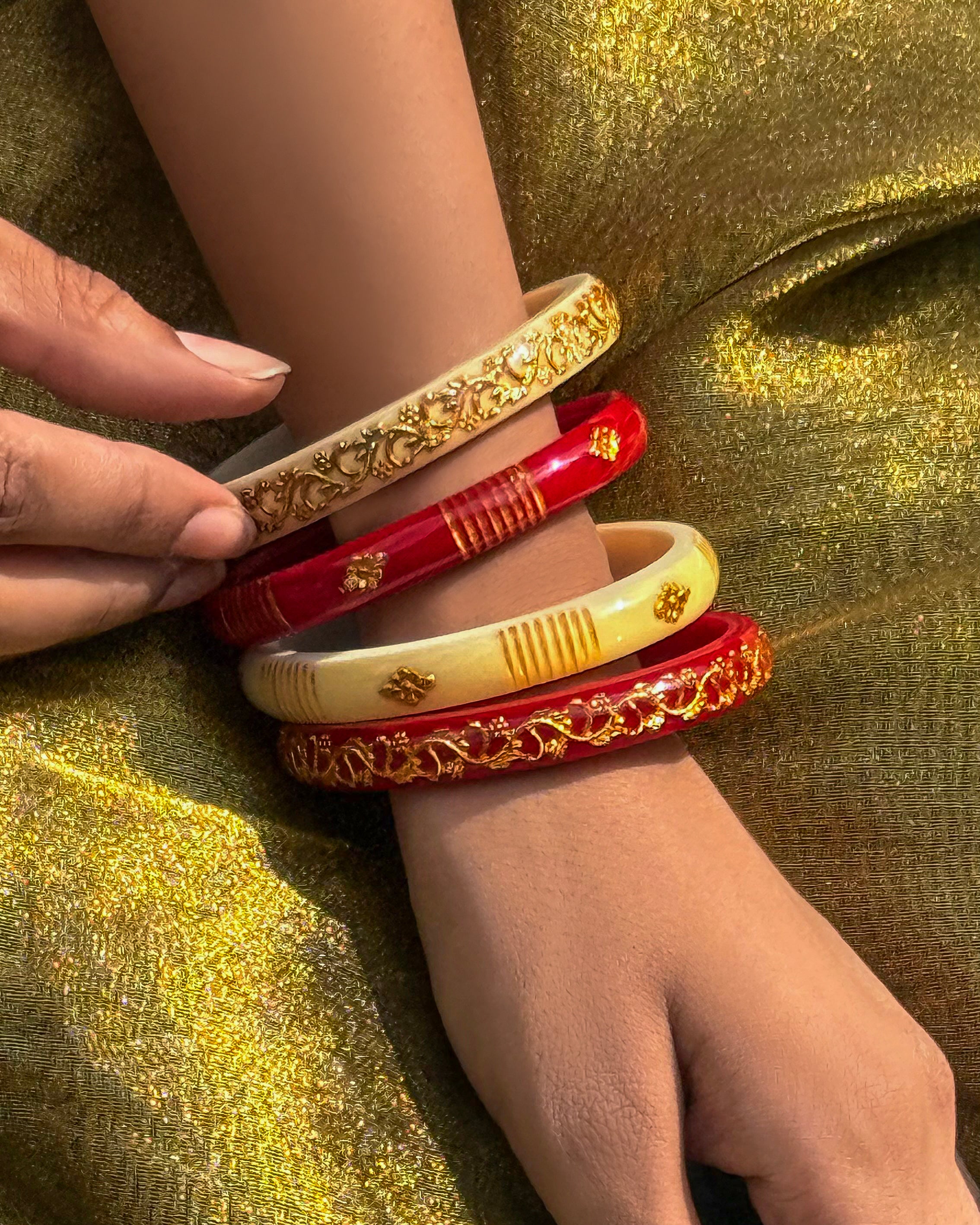 The Off-white Sakha Pola Bangle carries the essence of tradition, crafted with intricate gold flower jali artistry. Worn during weddings, festivals, and sacred ceremonies, it symbolizes cultural pride and enduring grace. Each detail reflects timeless craftsmanship, making it a treasured heirloom for generations.