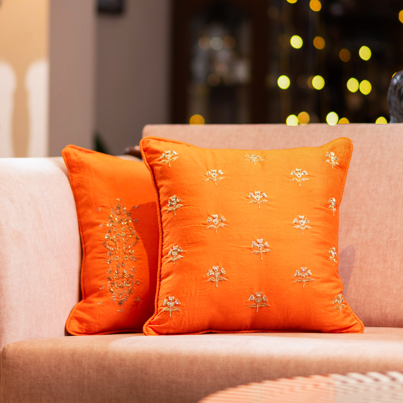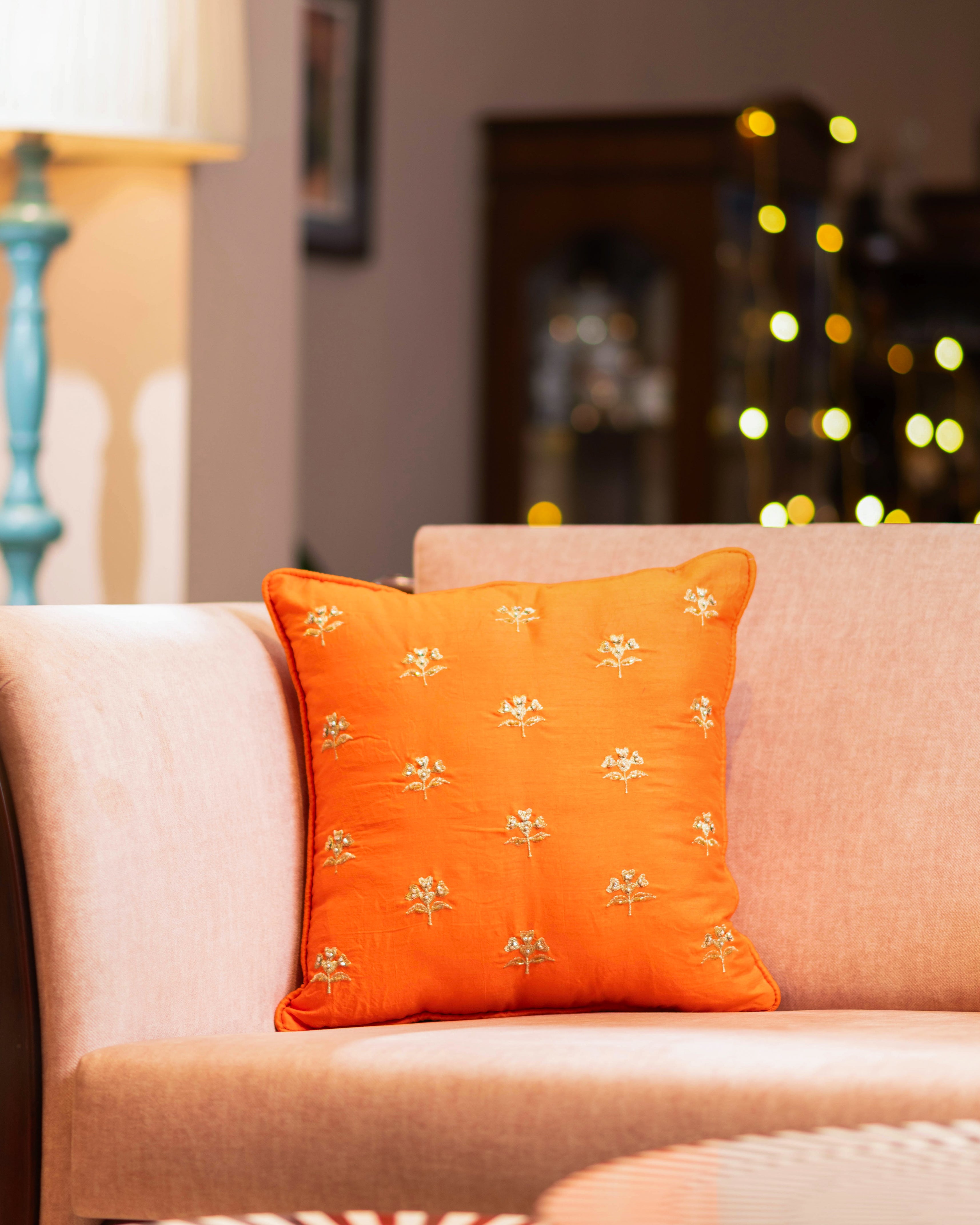 Brighten up your living space with our Orange Cushion embellished with Gold Embroidery and Beads. The rich orange hue radiates warmth and positivity, while the intricate gold threadwork and bead accents bring a touch of festive elegance. Perfect for adding vibrancy to your sofa, bed, or lounge area, this cushion is designed to blend tradition with sophistication. A stunning choice for festive décor or as a thoughtful gift, it transforms any setting with effortless charm.