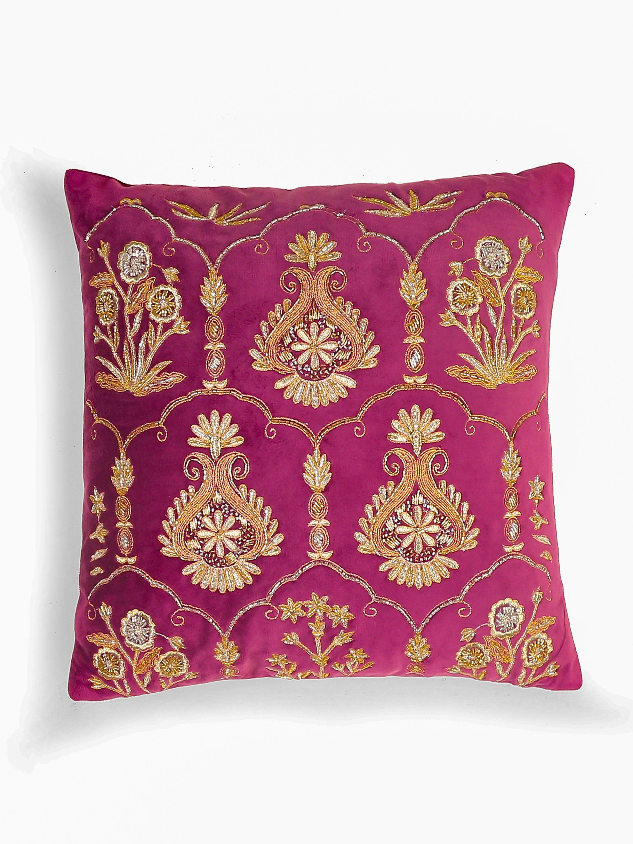 The royal violet cushion cover in velvet is exquisitely zari embroidered and embellished. Bring home this beautiful cushion cover to add a royal touch to your spaces. Add more from the cushions and décor from this collection to complete the look.