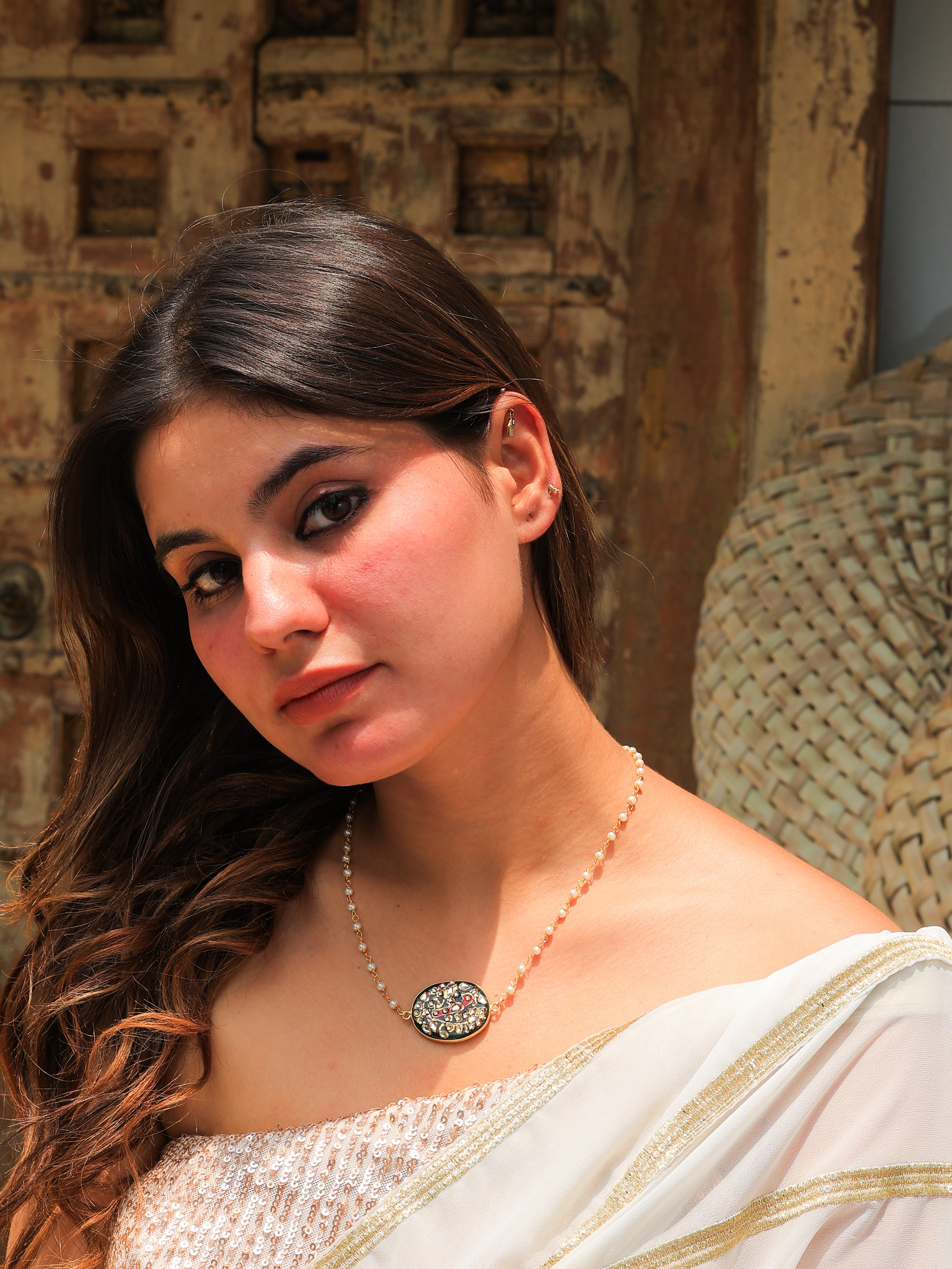 Add a splash of artistic charm to your collection with this exquisite enamel pendant necklace, beautifully paired with a delicate beaded chain. The pendant features intricate enamel work in vibrant hues, showcasing fine craftsmanship and timeless elegance. Suspended on a chain of carefully strung beads, this necklace exudes a perfect balance of traditional artistry and modern appeal. Ideal for festive occasions or to add a pop of color to everyday attire, it’s a versatile piece that speaks of understated sophistication and unique style.