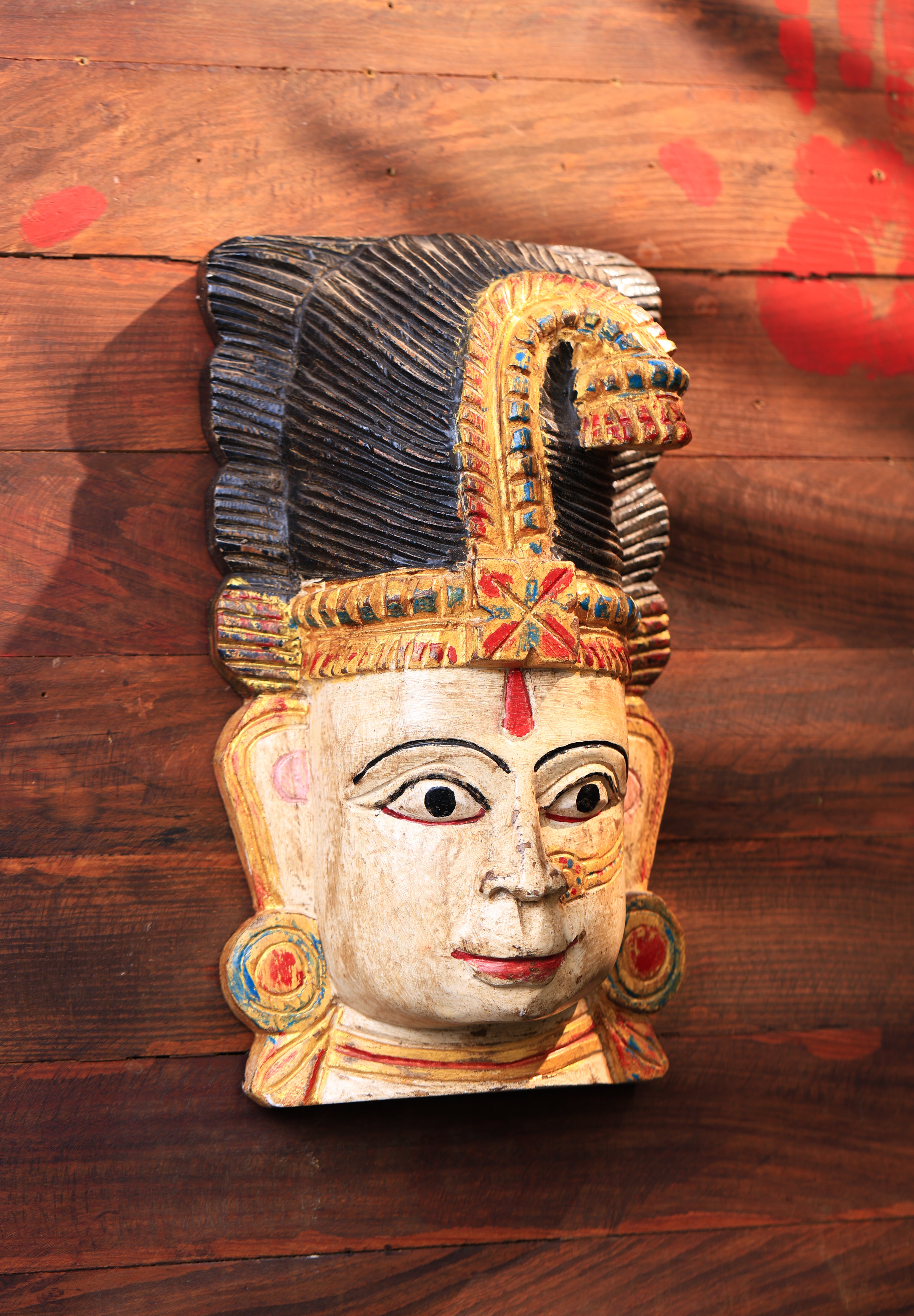 Bring divine grace and artistic elegance into your space with this exquisite Lakshmi wooden mask, meticulously hand-carved and hand-painted by skilled artisans. Depicting the Hindu goddess of wealth, prosperity, and abundance, this mask radiates serenity and blessings.