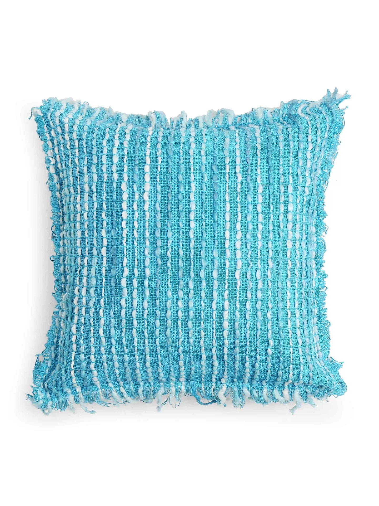 This hand woven Turq and white cushion cover has a distinctive charm. Add the color to your spaces and make them look stunning. The vibrance of this cushion will add sophistication to your spaces. Fringes in the design bring the require boho feel. Combine with the matching throw in this collection to complete the look.