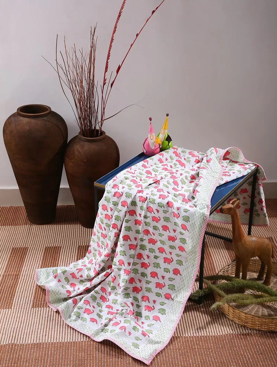 Our Baby Dohar elephant print has a hand-drawn feel that gives it a truly artistic touch. Adorned with a variety of green and pink cute little elephant, each one appears to be hand painted against the solid white background. And, since it's made from 100% cotton, the unimaginable softness and comfiness is basically a work of art . Just right for your baby .