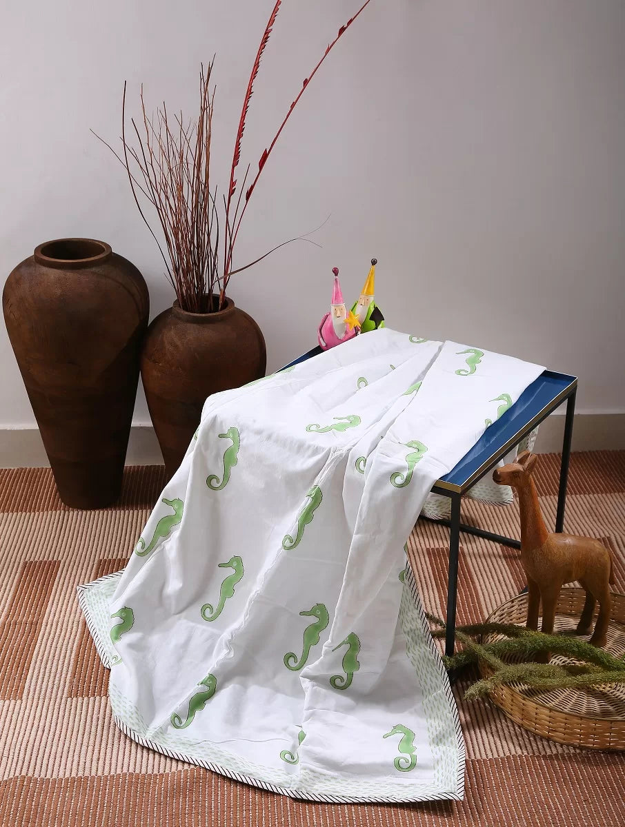 Our reversible Baby Dohar with sea horse print has a hand-drawn feel that gives it a truly artistic touch. Adorned with a variety of green little sea horse , each one appears to be hand painted against the solid white background. And, since it's made from 100% cotton, the unimaginable softness and comfiness is basically a work of art . Just right for your baby .
