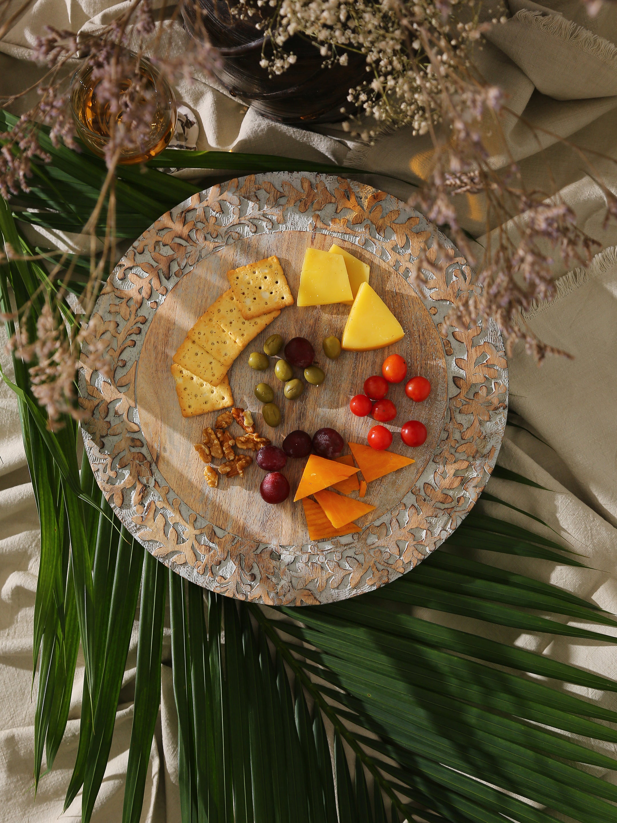 Chopping Board - Grey White Wash Finish Lazy Susan Platter With Hand Carved Border
