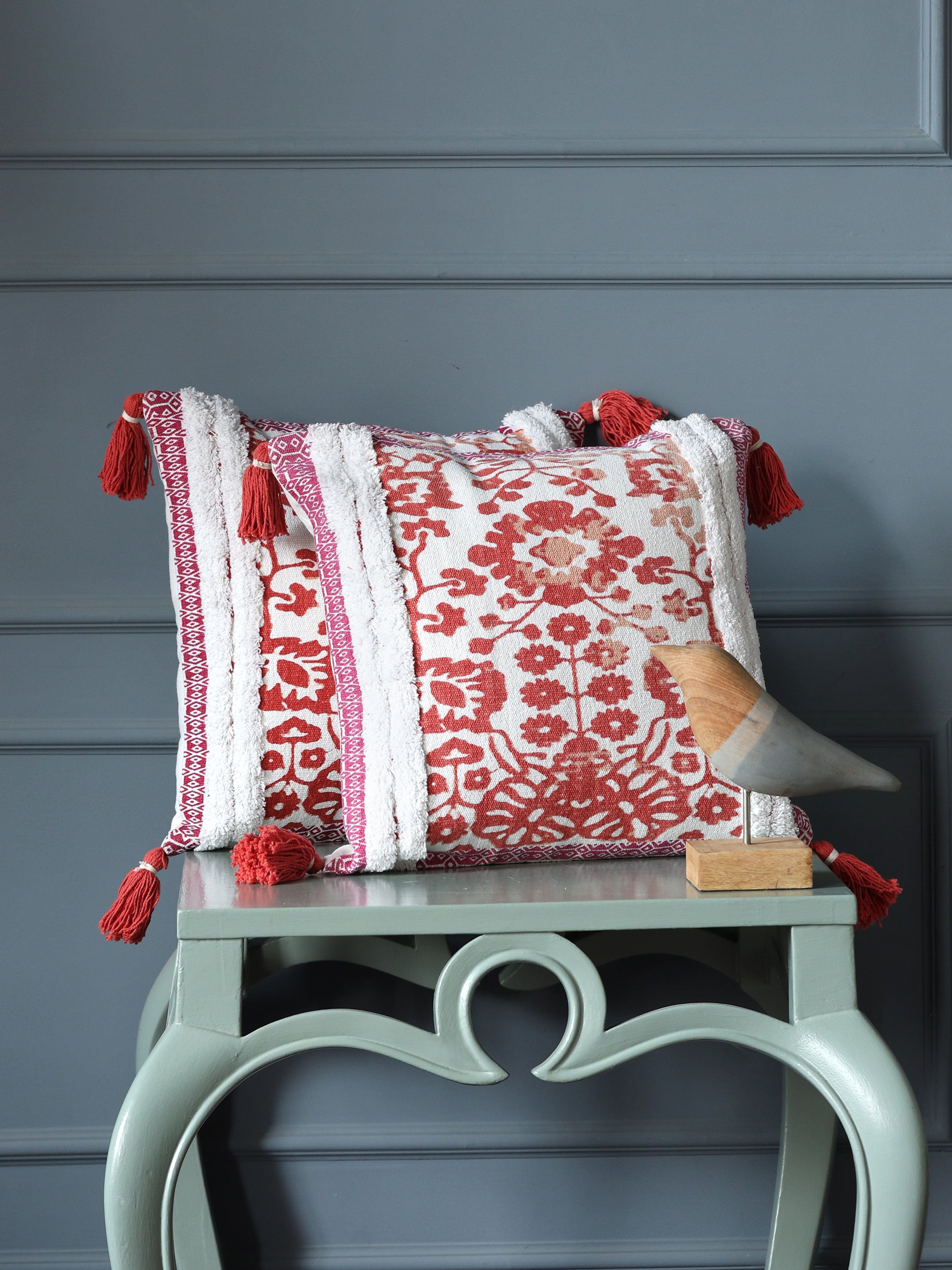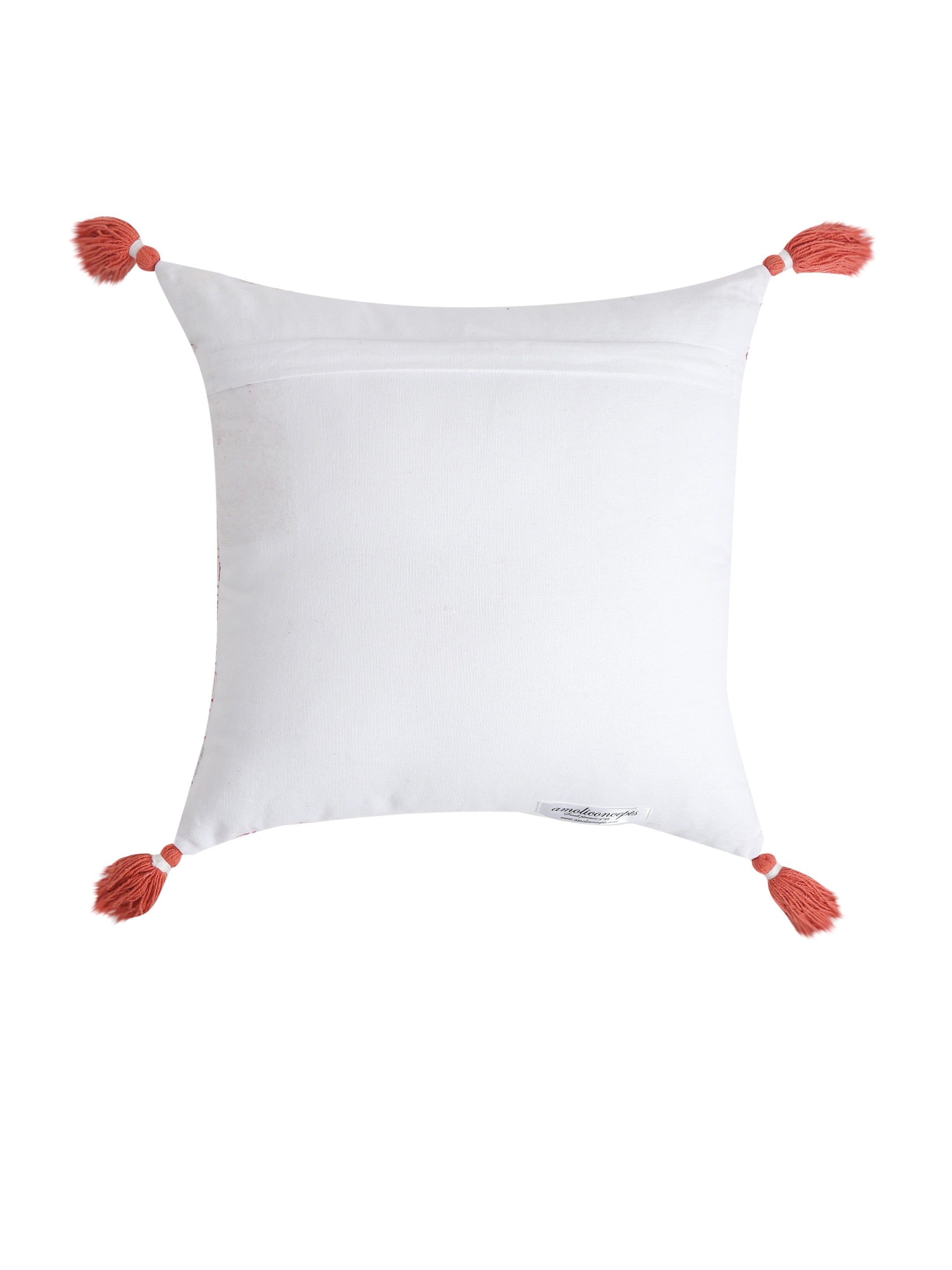Peach flower printed cushion cover with fringes and tassels (Set of 2)