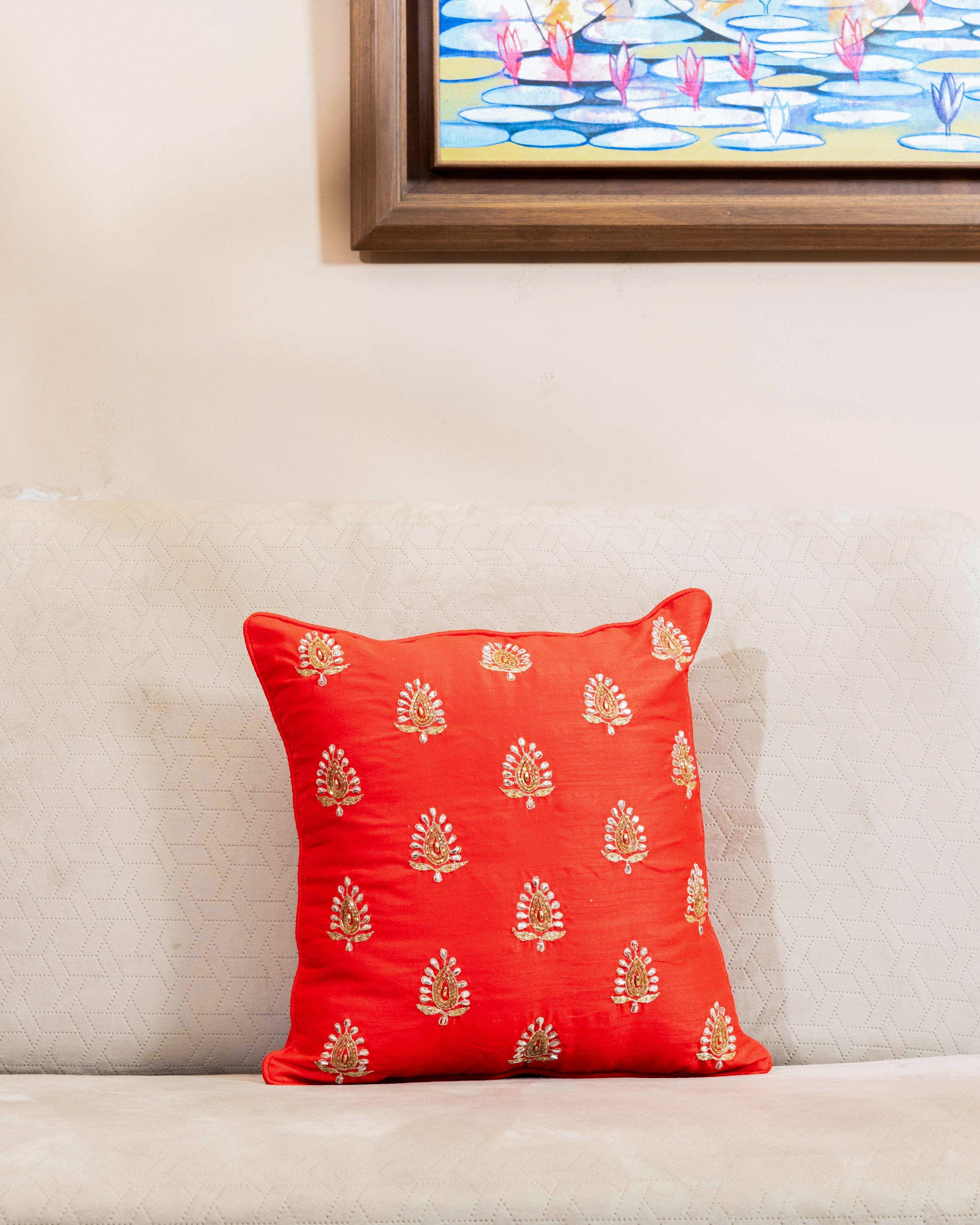 Brighten up your living space with our Red Cushion embellished with Gold Embroidery and Beads. The rich orange hue radiates warmth and positivity, while the intricate gold threadwork and bead accents bring a touch of festive elegance. Perfect for adding vibrancy to your sofa, bed, or lounge area, this cushion is designed to blend tradition with sophistication. A stunning choice for festive décor or as a thoughtful gift, it transforms any setting with effortless charm.